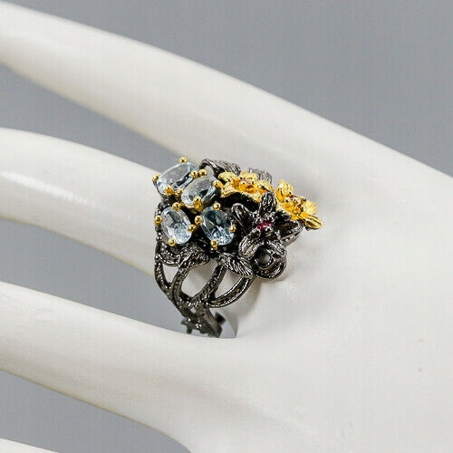 Wir bieten Ihnen einen neuen, gelbvergoldeten und schwarzrhodinierten Silber - 925er Ring mit natürlichem Blautopas und Granaten (Rhodoliten) an.