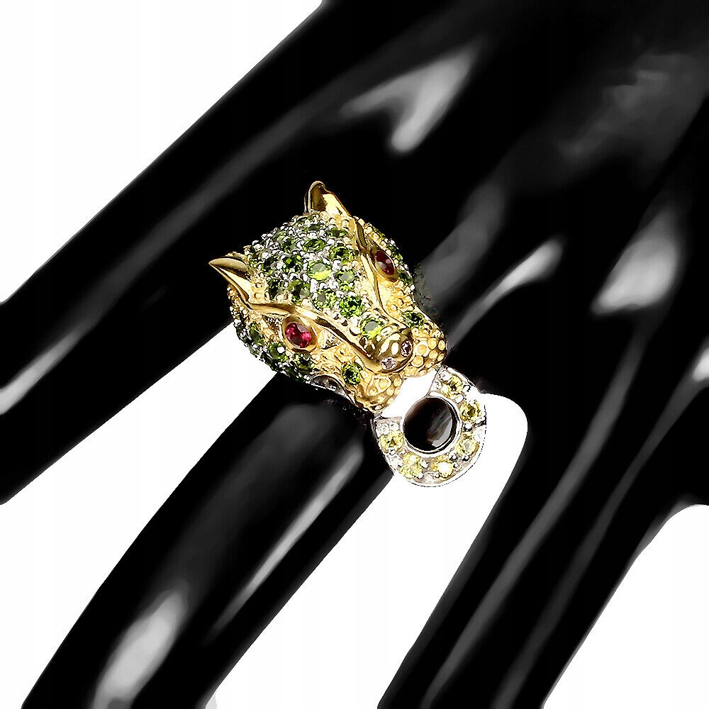 Wir bieten Ihnen einen neuen, vergoldeten Ring aus Gelb- und Weißgold 14K, Silber - 925 mit natürlichen Diopsiden, Granaten (Rhodoliten) und Songea-Saphiren an.