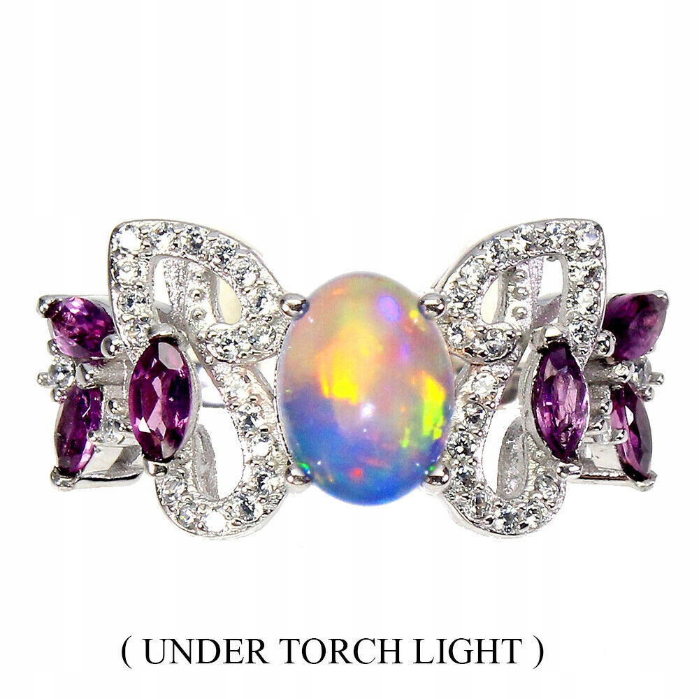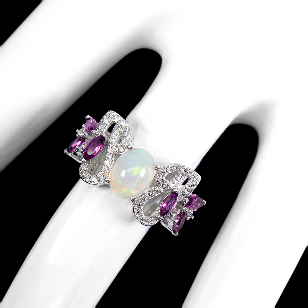 Wir bieten Ihnen einen neuen, vergoldeten 14 Karat Weißgold, Silber - 925er Feinheitsring mit natürlichem Feueropal und Granaten (Rhodoliten) und Zirkonias.