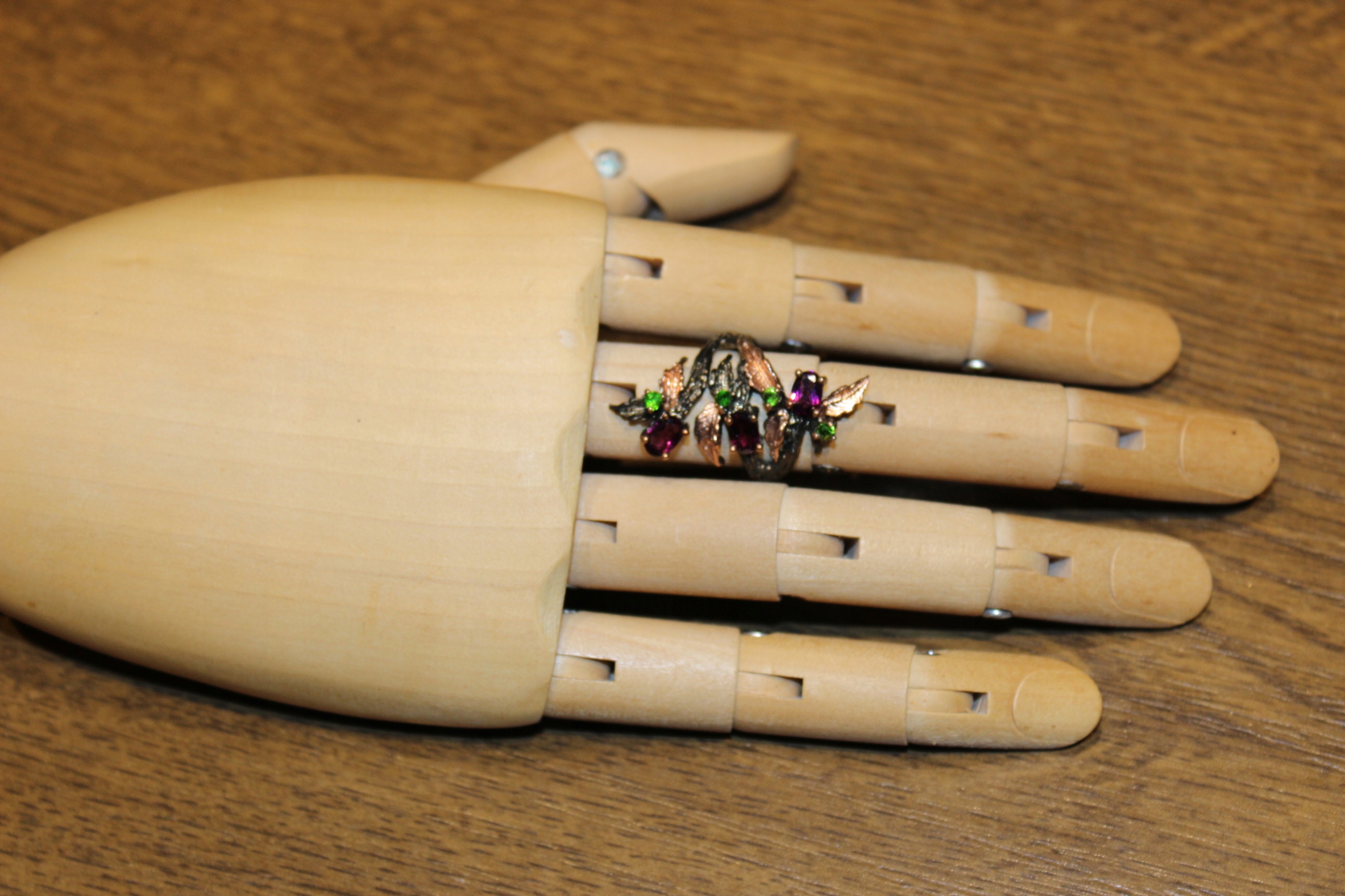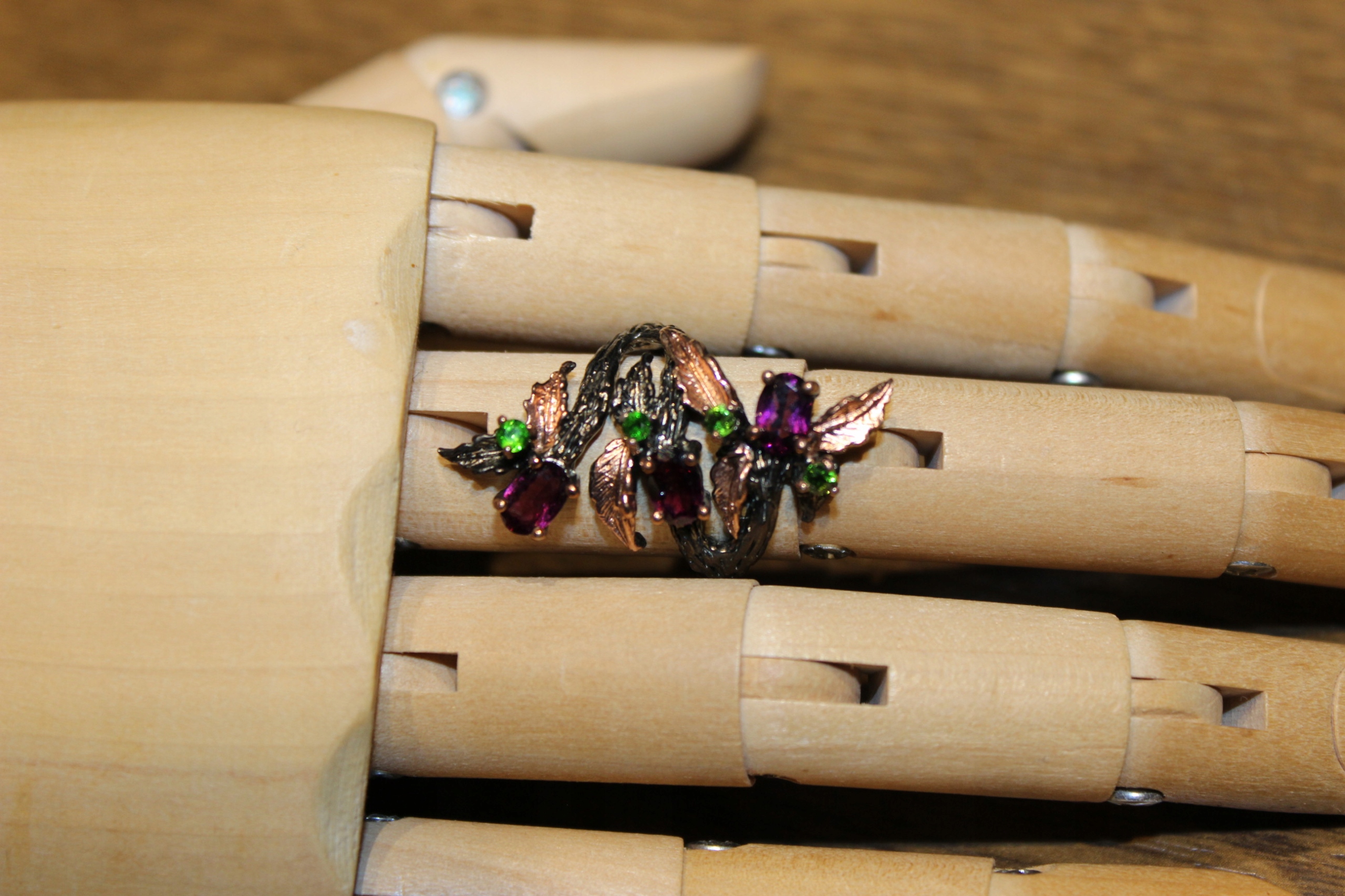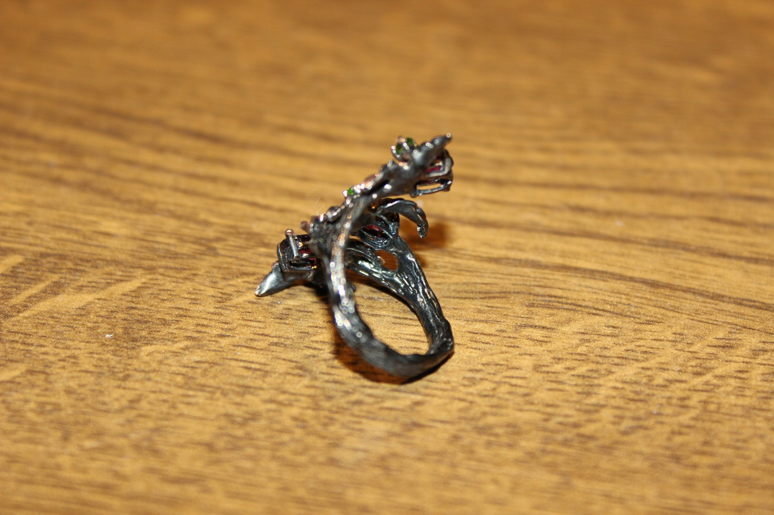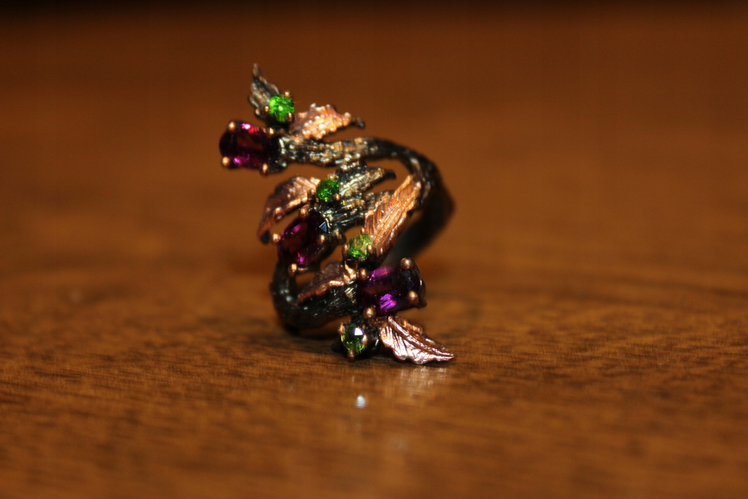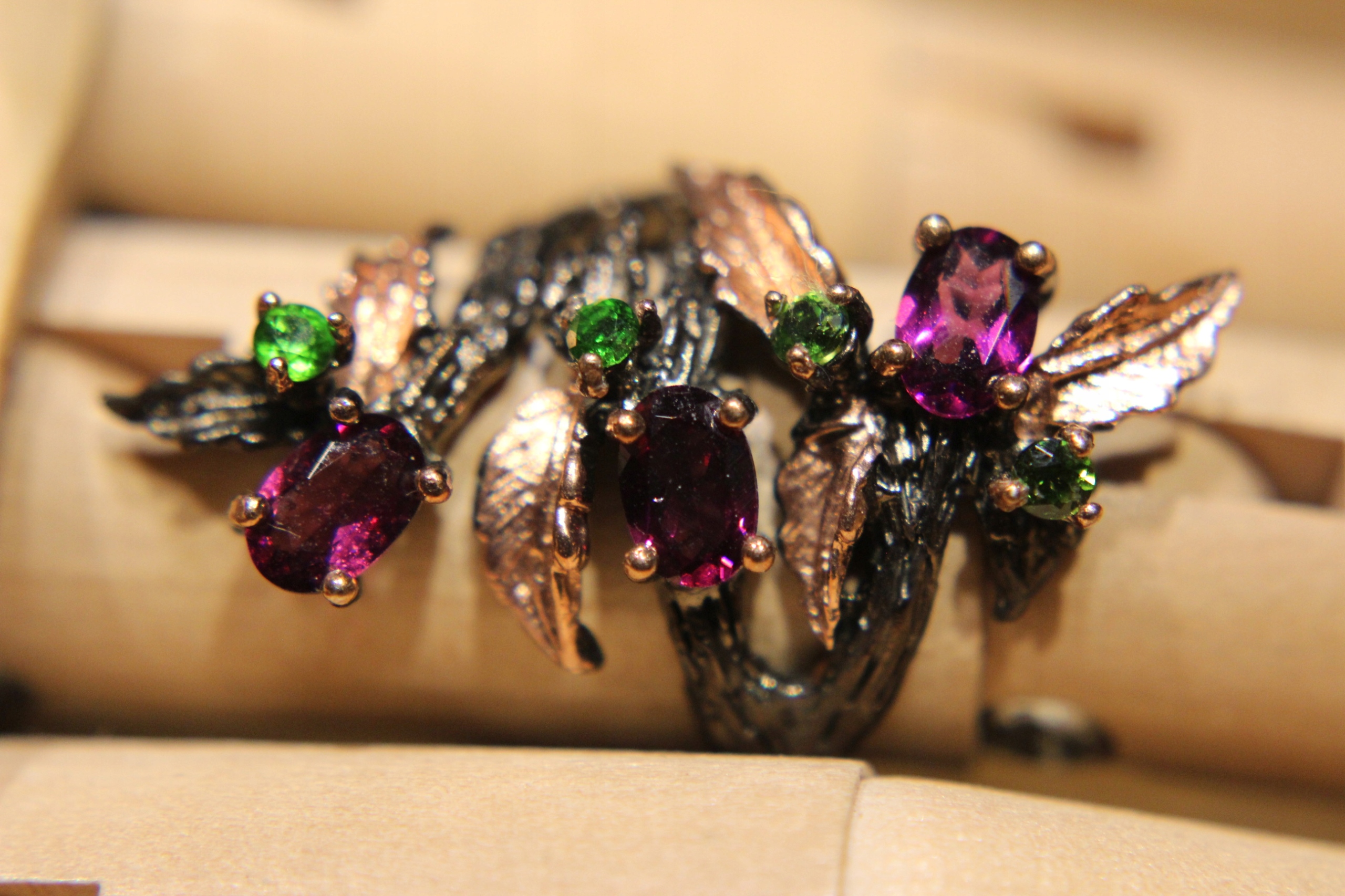Ich verkaufe einen neuen (ohne Etikett), schwarz rhodinierten, 14 Karat rosévergoldeten, Silber-925-Ring mit natürlichen Rhodoliten und Diopsiden.