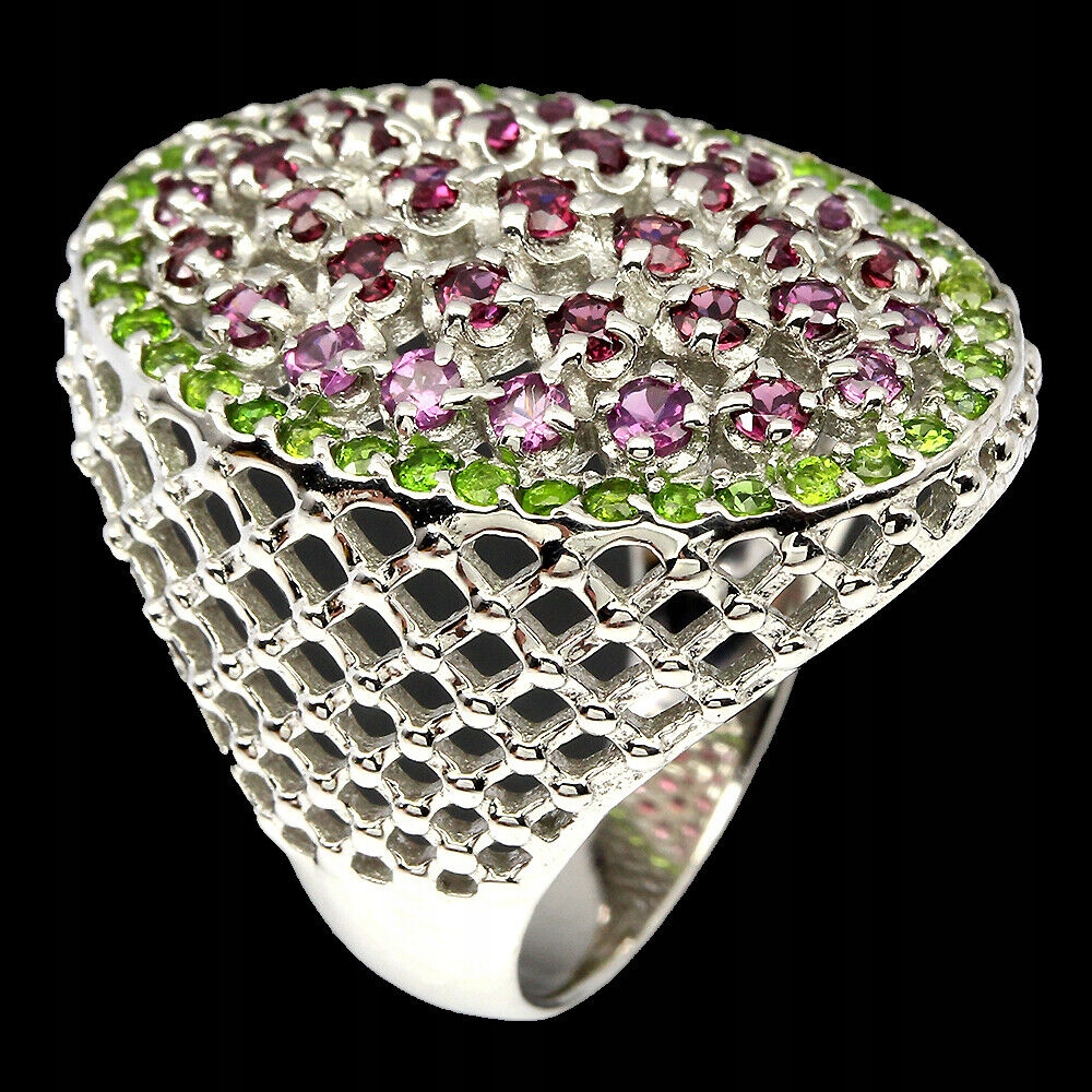 Ich verkaufe einen neuen (ohne Etikett), 14 Karat weiß vergoldeten Silber-925-Ring mit natürlichen Diopsiden und Granaten (Rhodoliten).