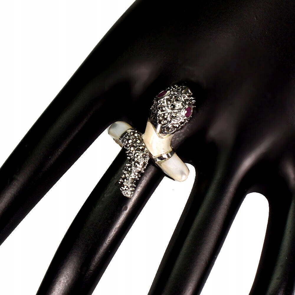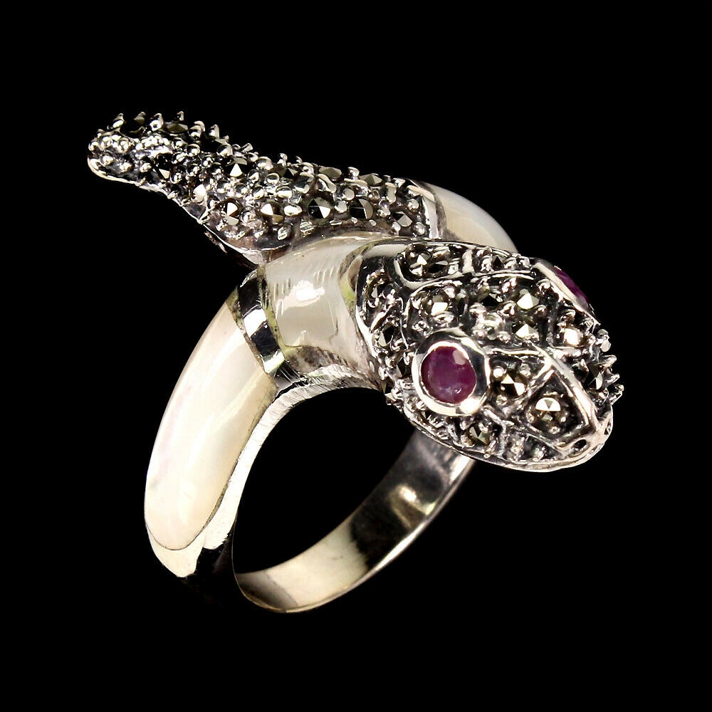Ich verkaufe einen neuen (ohne Etikett), vergoldeten 14 Karat Weißgold - 925er Silberring mit natürlichen Rubinen, Markasiten und Perlmutt.