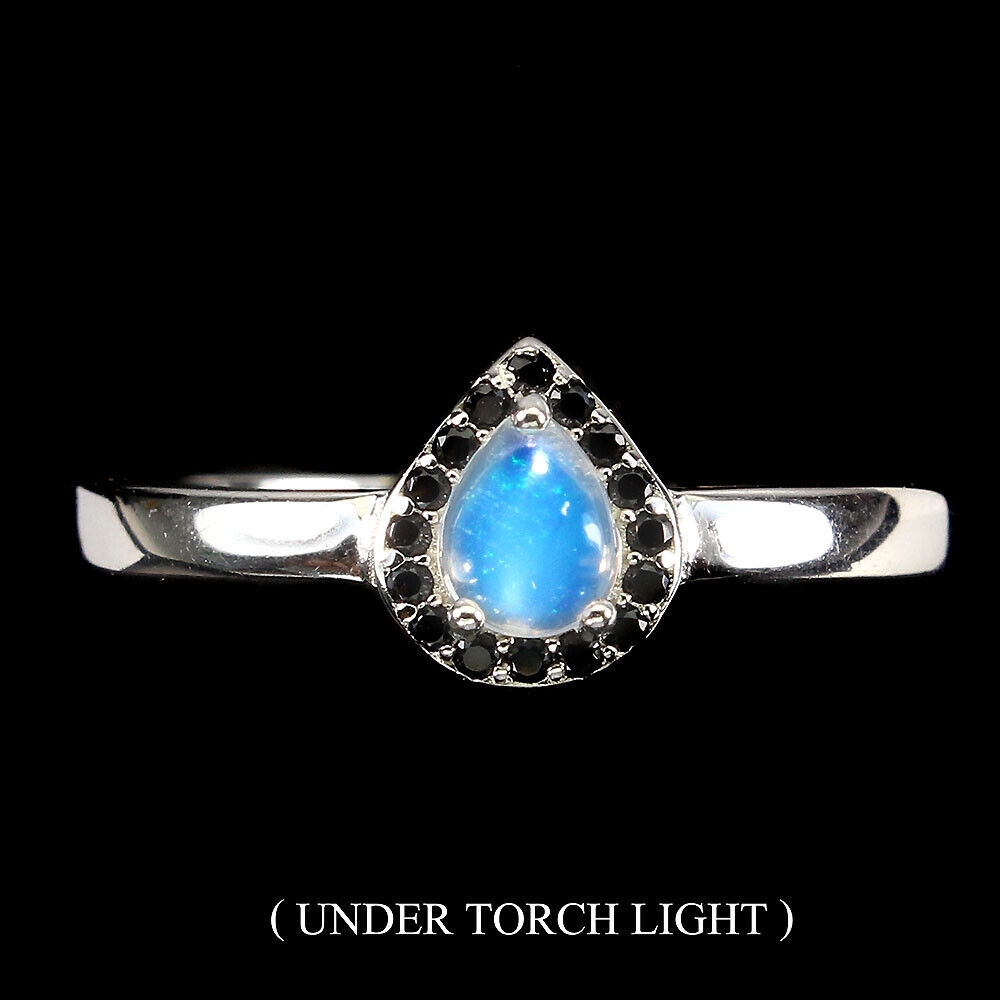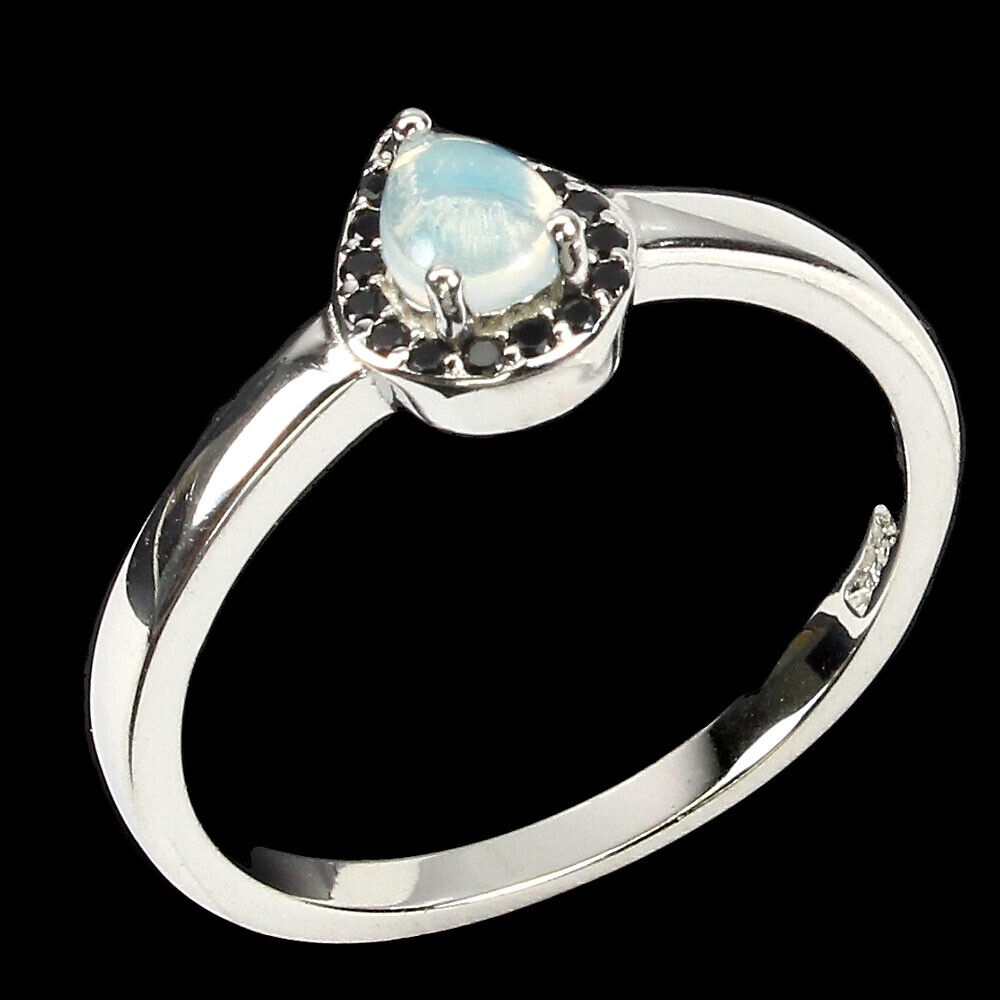 Wir bieten Ihnen einen neuen, 14K weißvergoldeten Silberring - 925 mit natürlichem Feueropal und schwarzen Spinellen.