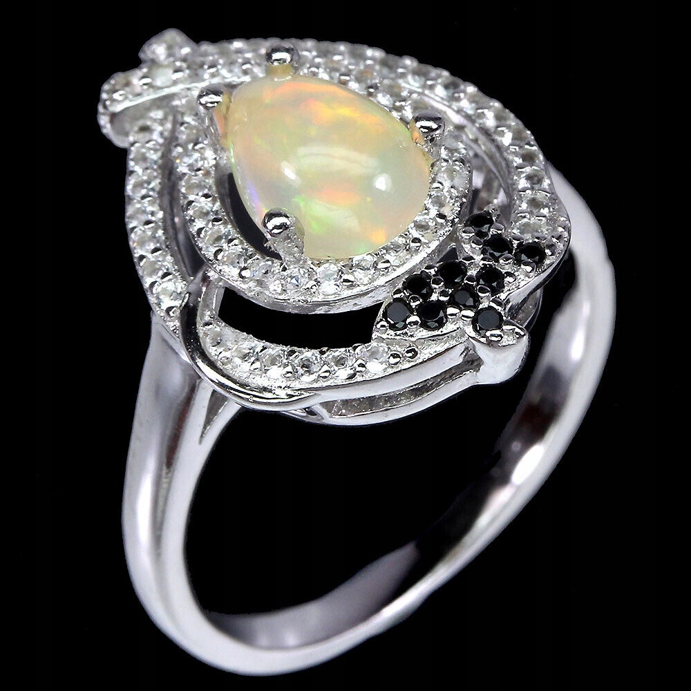 Wir bieten Ihnen einen neuen, 14 Karat weiß vergoldeten, Silber - 925er Feinheitsring mit natürlichem Feueropal, weißem Topas und schwarzen Spinellen an.