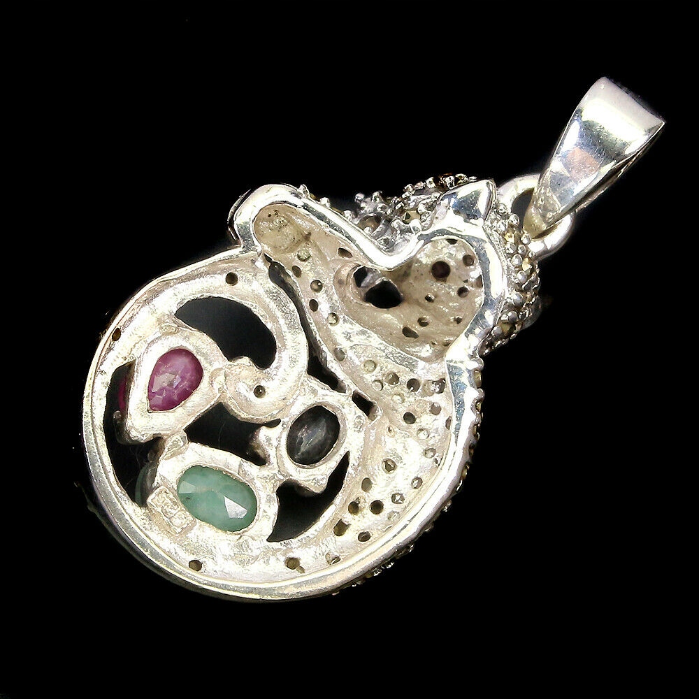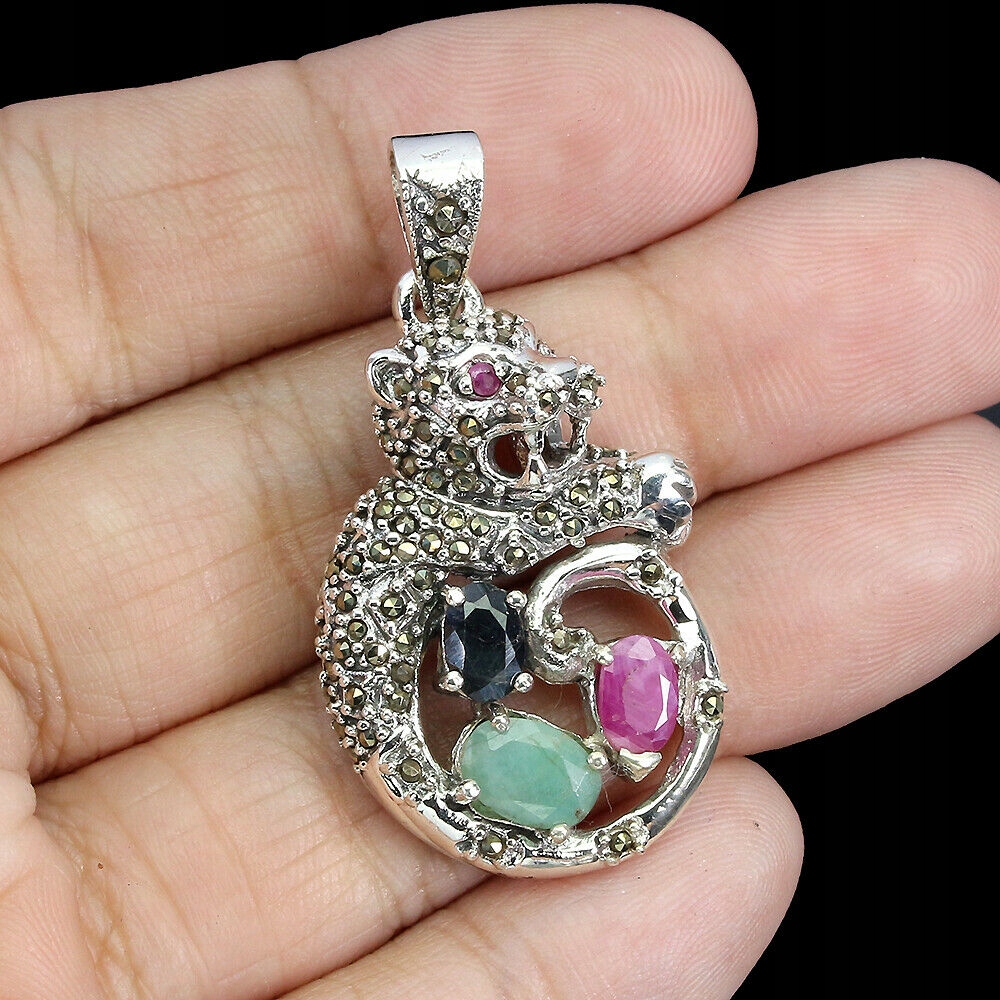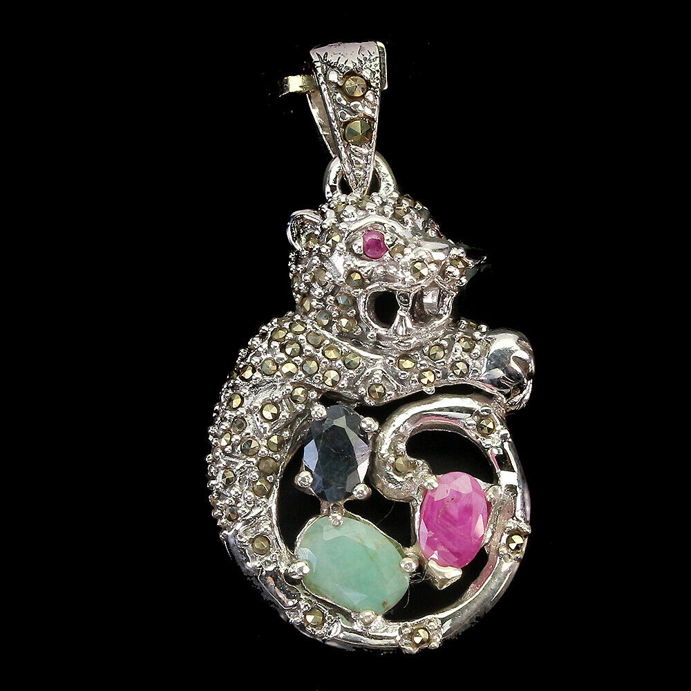Wir bieten Ihnen einen neuen Anhänger aus Silber - 925 mit natürlichen Markasiten, Rubinen, blauen Saphiren und Smaragden an. Schöner Tiger.