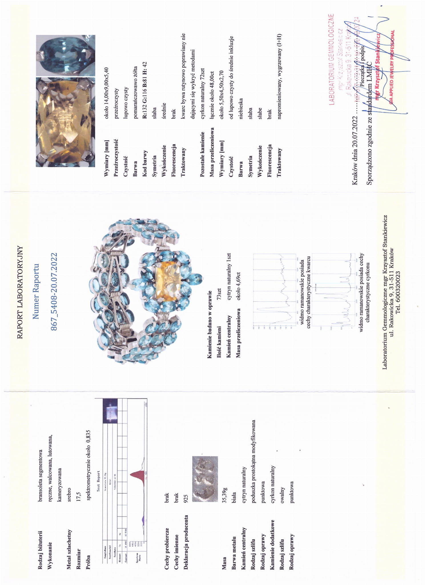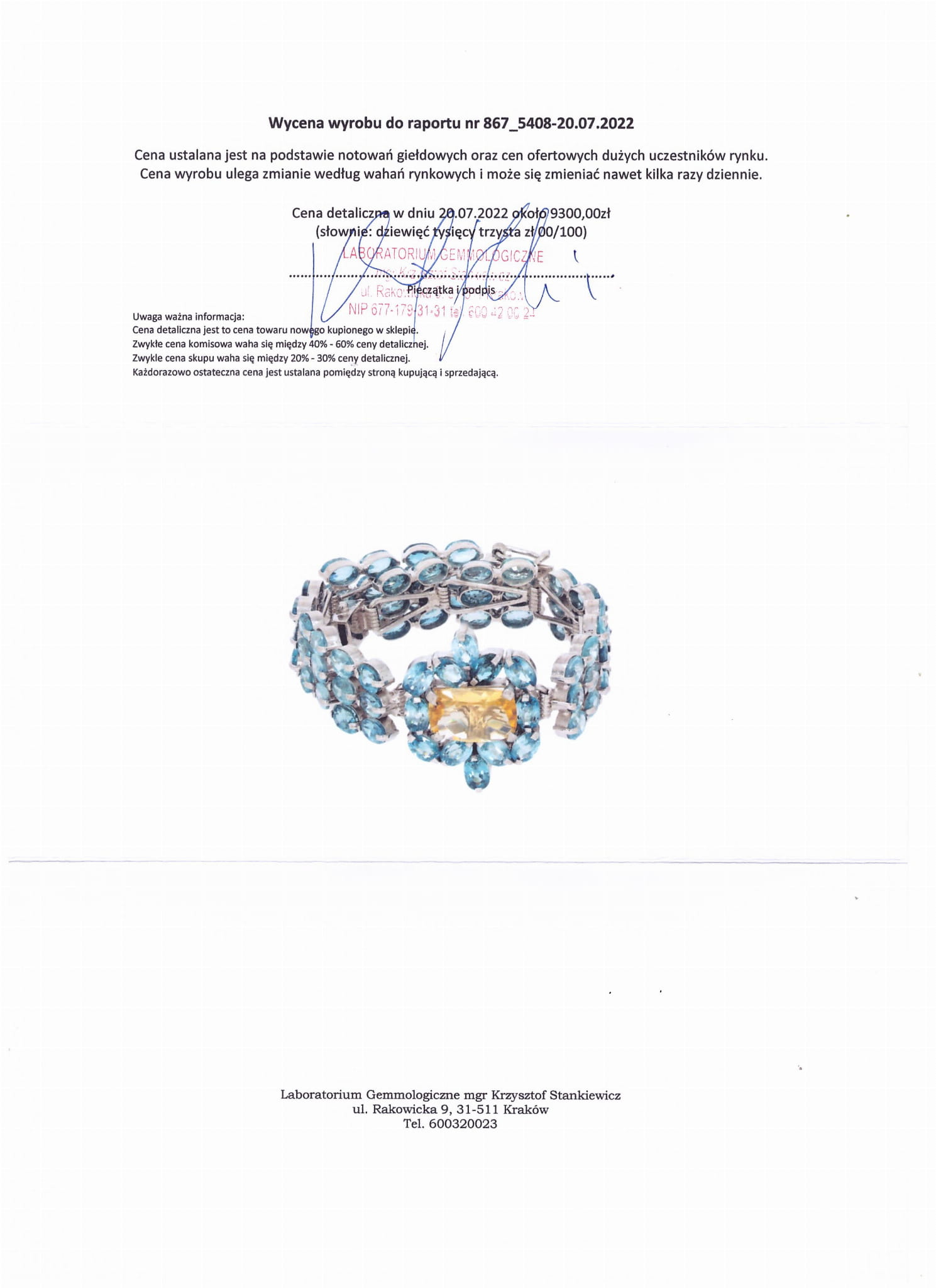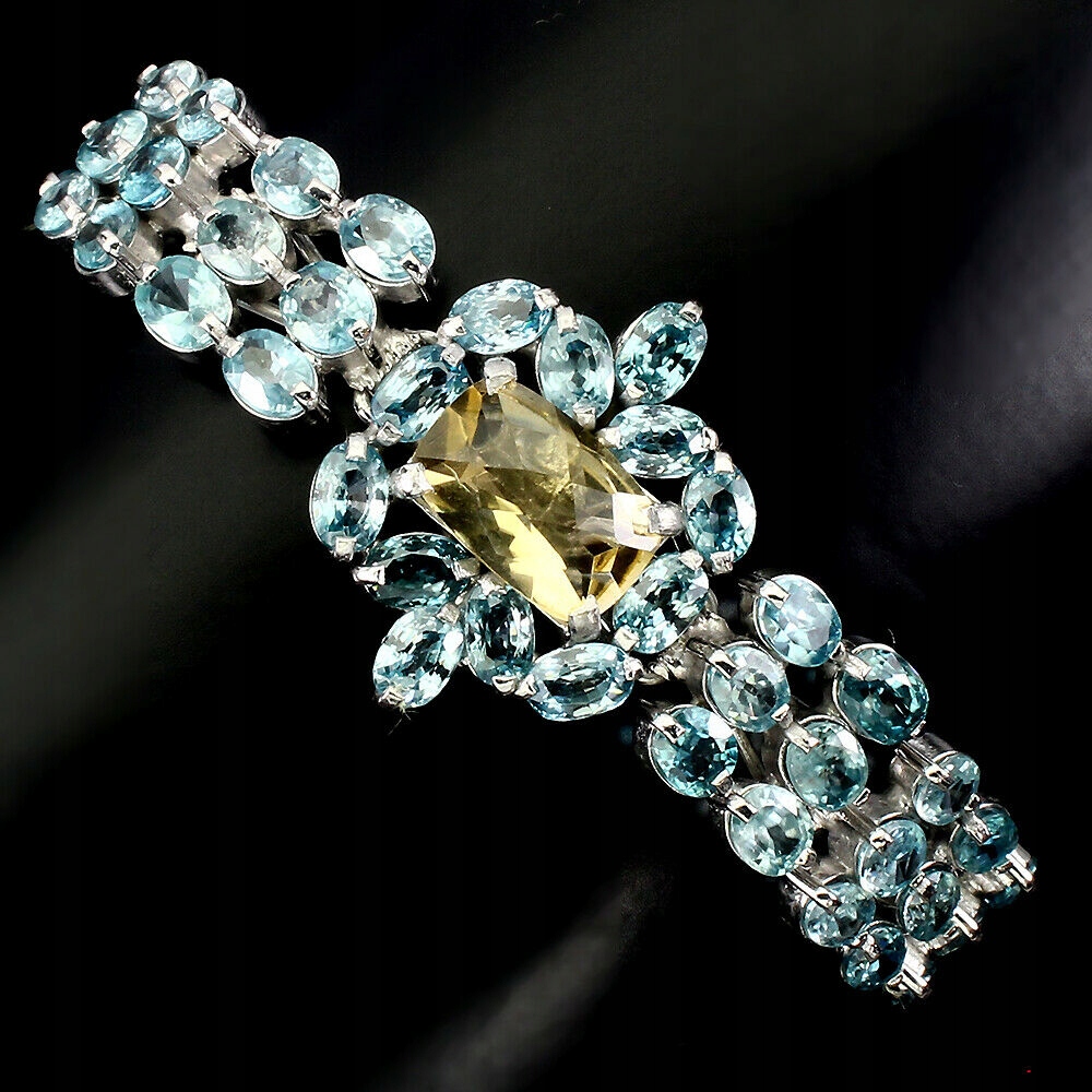 Ich verkaufe ein neues, weißvergoldetes Silber - 925 (spektrometrisch ca. 0,835) Armband mit natürlichem Citrin und Zirkonen. Es hat ein Zertifikat und eine Schätzung für 9.300 PLN. Es ist handgefertigt, gerollt, gelötet und kamerabeschichtet.