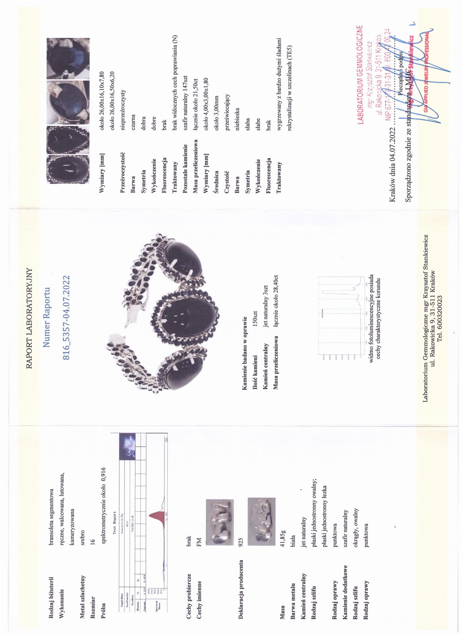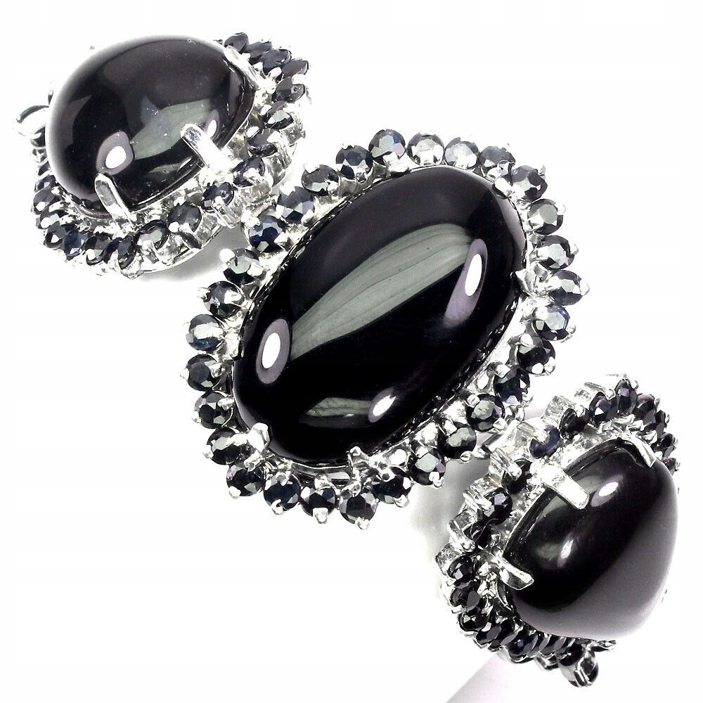 Anzahl der Steine: 150 Stk. Zentralstein: Naturjet 3 Stk., andere Steine: Natursaphir: 147 Stk. Ihre genauen Parameter sind im Laborbericht beschrieben - Zertifikat auf dem Foto sichtbar.