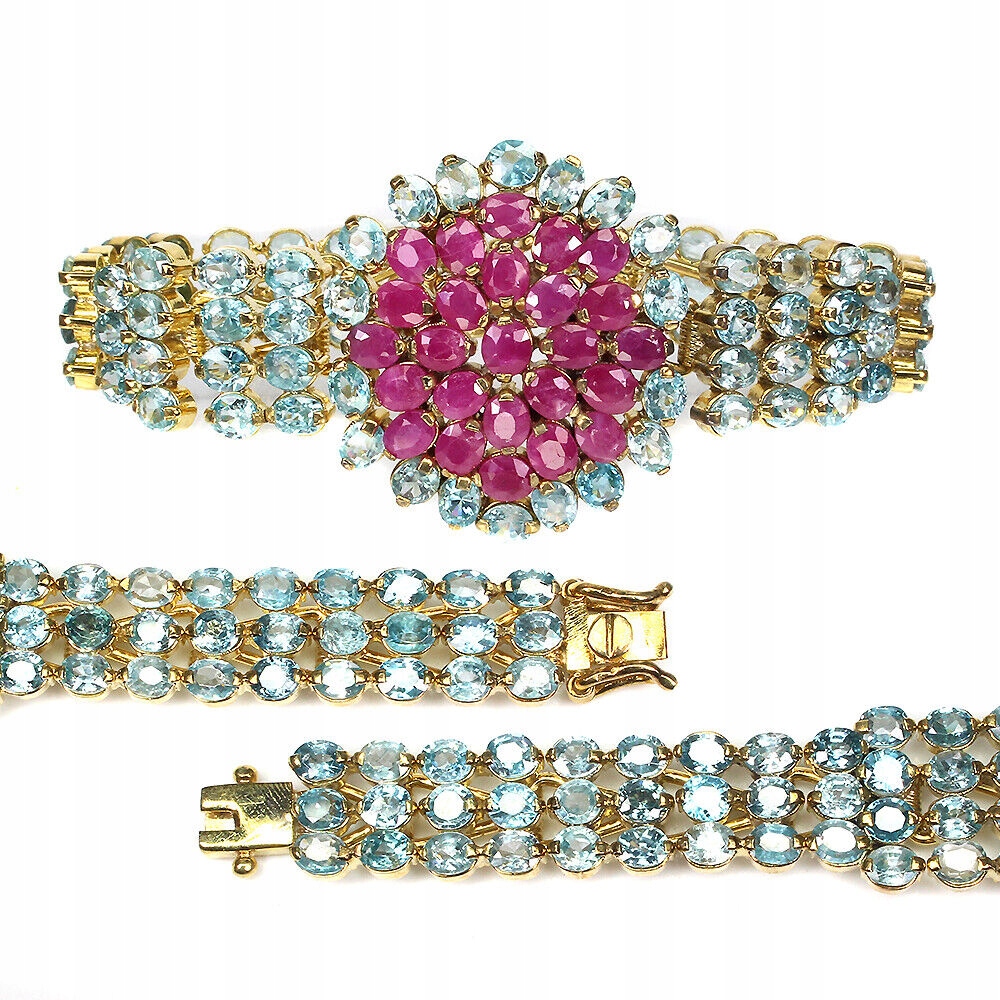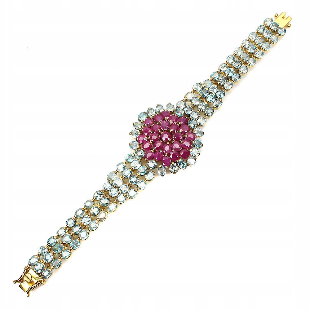 Wir bieten Ihnen ein neues, gelb 14K vergoldetes Silber-925-Armband mit natürlichen blauen Zirkonen (dies sind sehr seltene, teure Steine) und Rubinen.