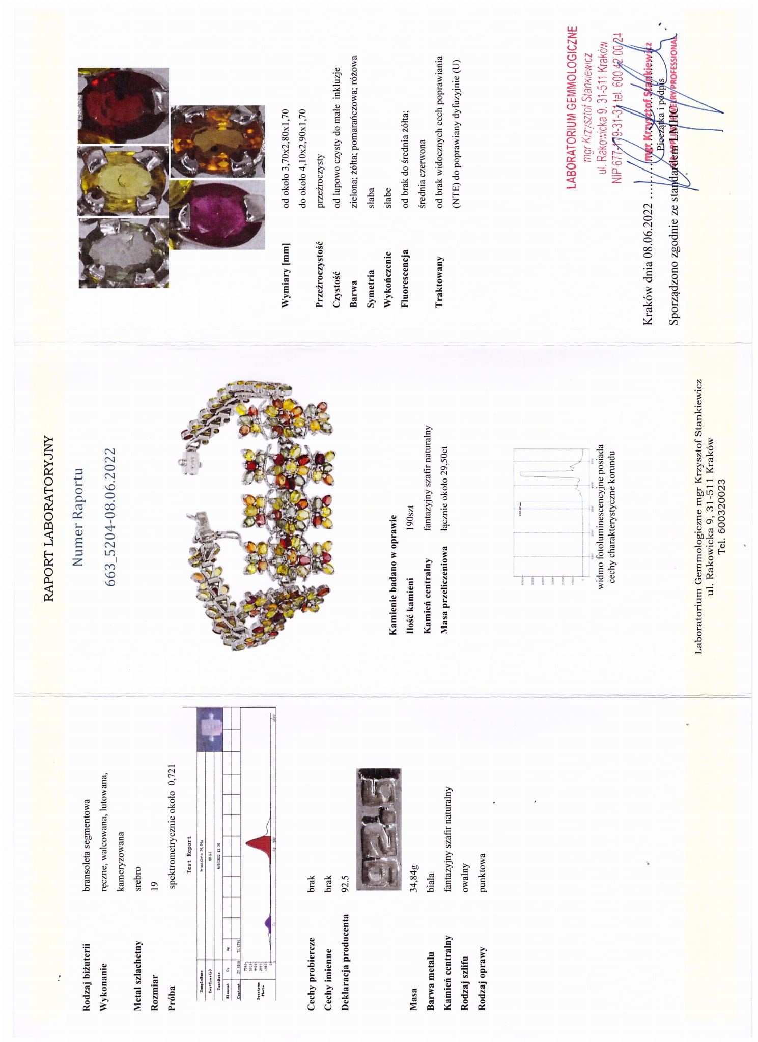 Saphire sind einzigartig in wunderschönen Farben in Form von Blumen. Es hat ein Zertifikat und eine Schätzung für 4.100 PLN. Es war Handarbeit. Es ist: gerollt, gelötet, kamerabeschichtet.