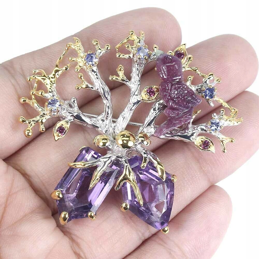 Ich verkaufe eine neue (ohne Etikett) vergoldete Gelb- und Weißgold 14 Karat Silber - 925 Brosche mit natürlichen Amethysten, Rubin in Zoisit, Tansaniten und Granaten (Rhodoliten).