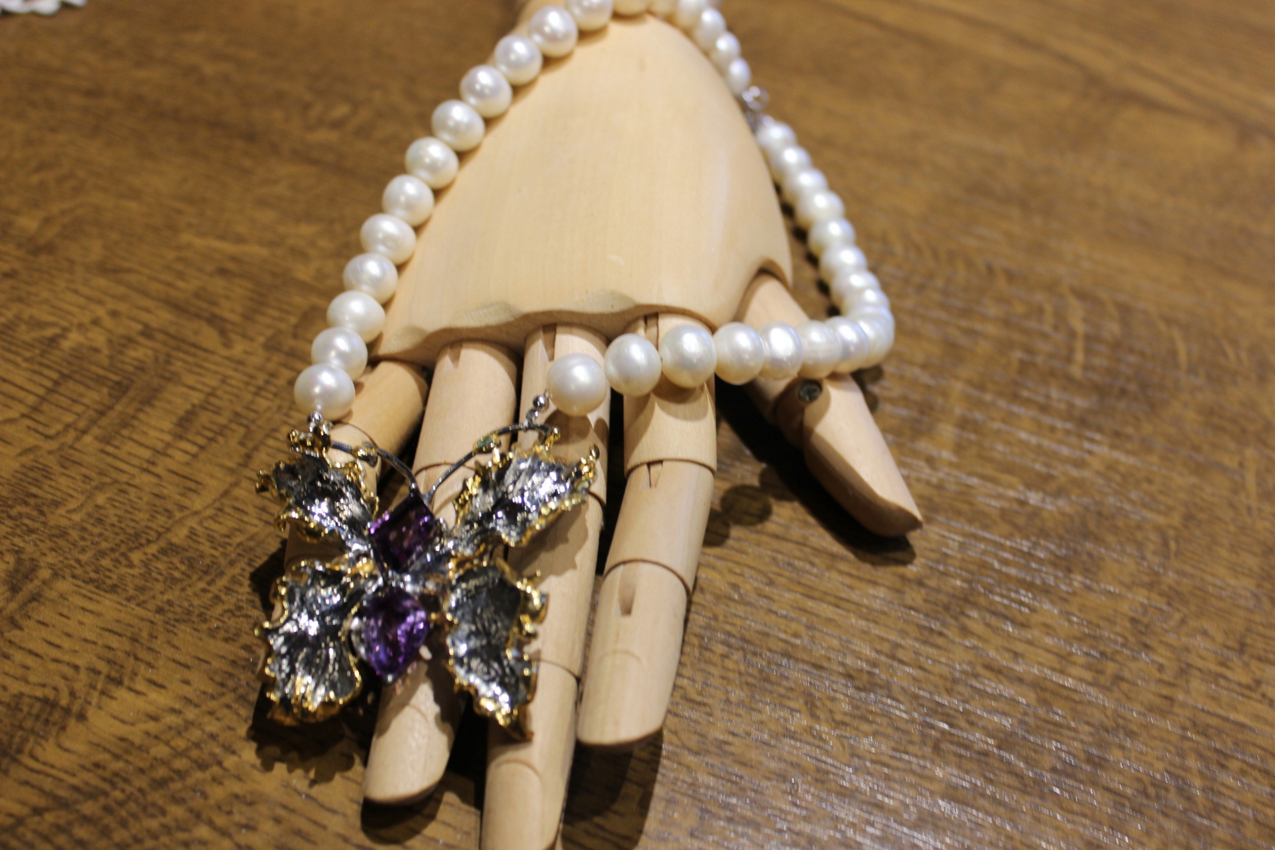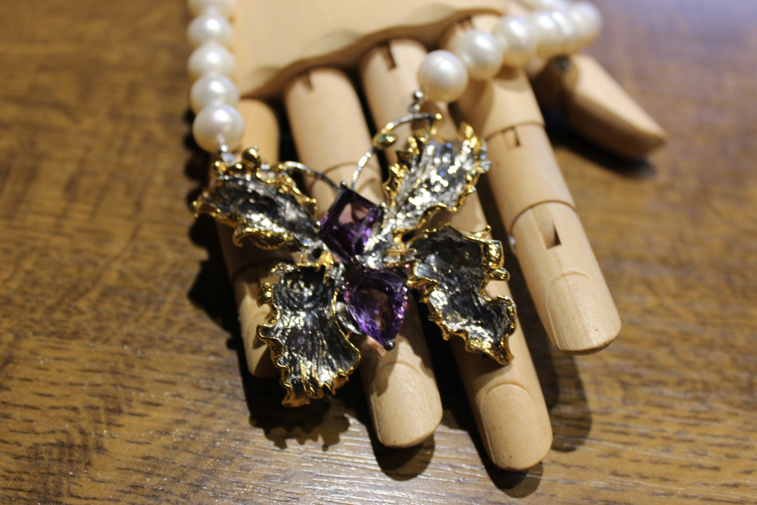 Ich verkaufe eine neue (ohne Etikett), vergoldete Silber-925-Halskette mit natürlichen Amethysten, Smaragden und Perlen.