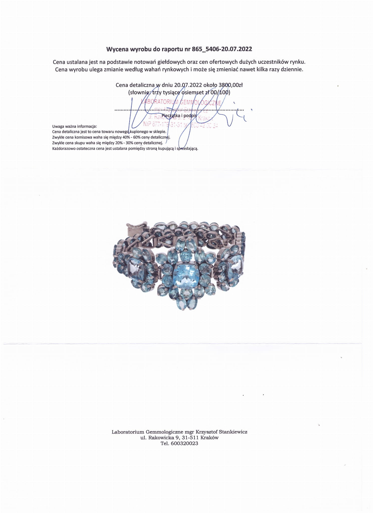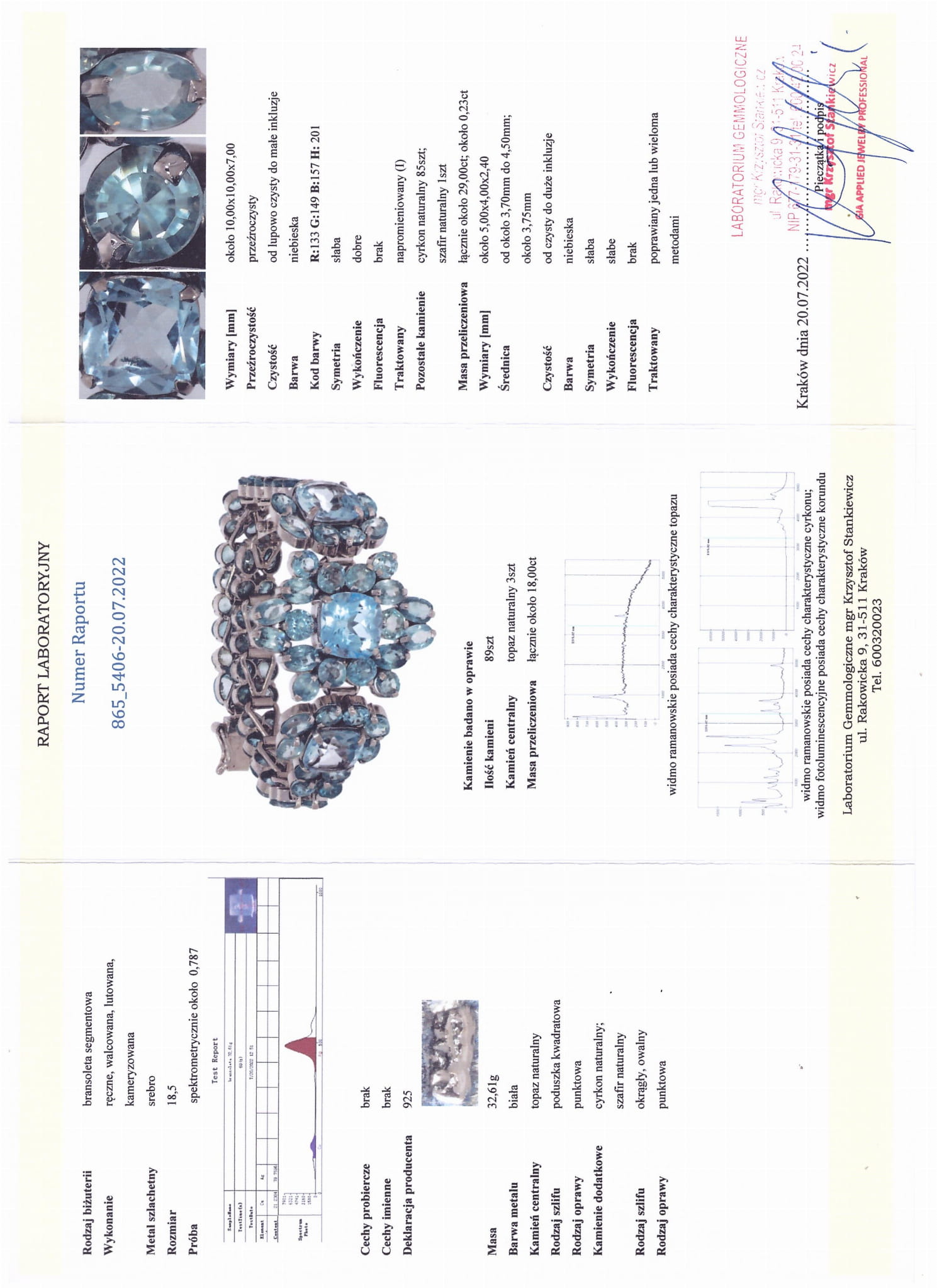 wir bieten Ihnen ein neues, vergoldetes Armband aus Weißgold, Silber - 925 (spektrometrisch ca. 0,787) mit natürlichen Zirkonen, natürlichem Topas und natürlichem Saphir an. Es ist handgefertigt, gerollt, gelötet und kamerabeschichtet. Es hat ein Zertifikat und eine Schätzung für 3.800 PLN.