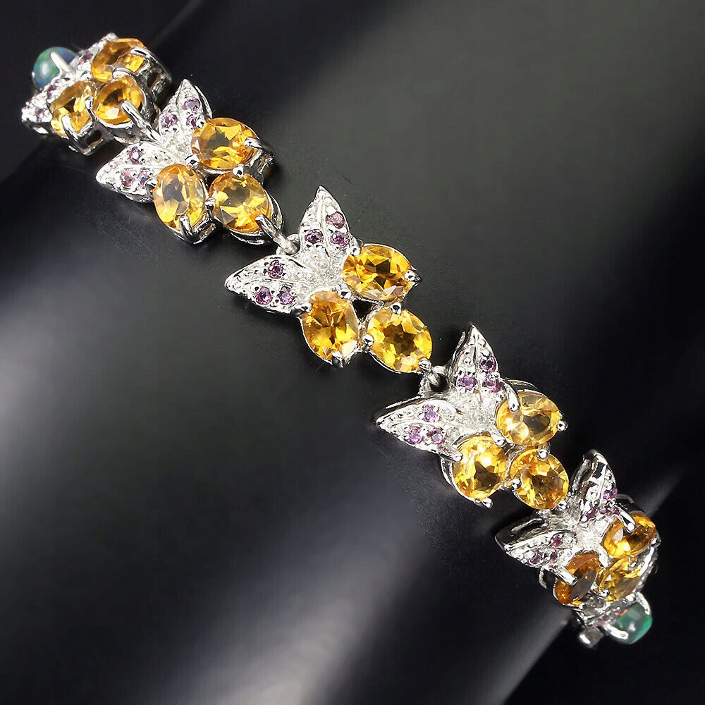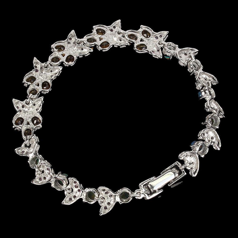 Wir bieten Ihnen ein neues, 14 Karat weiß vergoldetes 925er Silberarmband mit natürlichen schwarzen Opalen, Citrin und Granaten (Rhodoliten) an.
