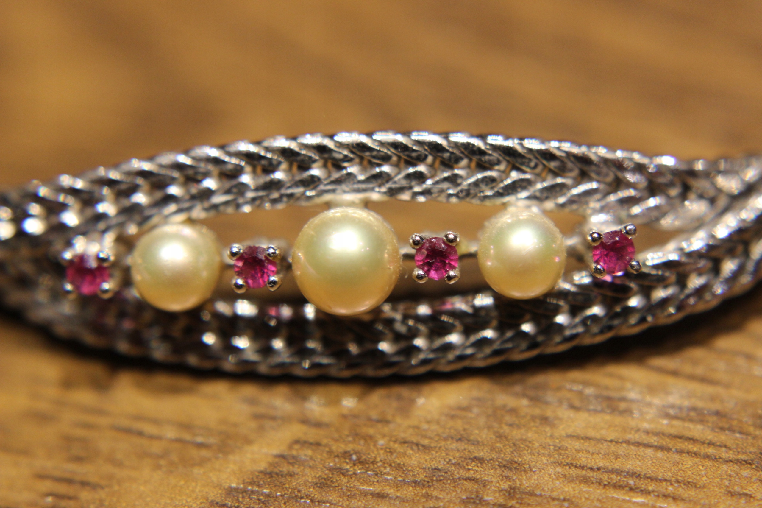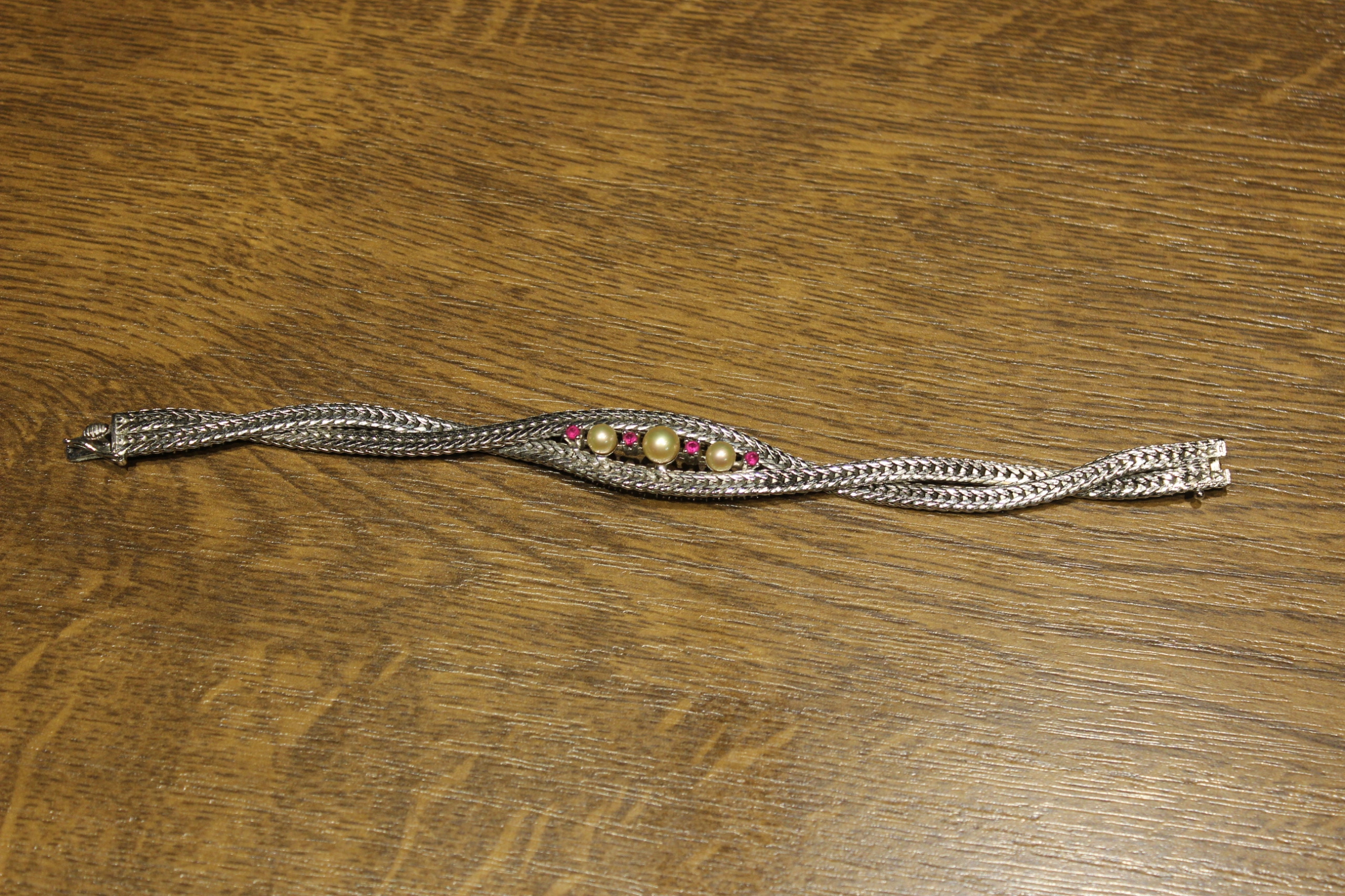 wir bieten Ihnen ein neues, silbernes Armband mit Perlen (Imitat) und rosafarbenem Glas an.