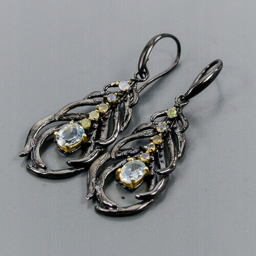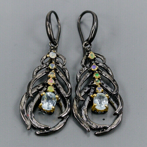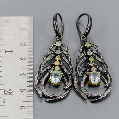 Wir bieten Ihnen neue, vergoldete Gelbgold und schwarz rhodinierte Ohrringe aus 925er Silber mit natürlichen Feueropalen und blauem Topas.