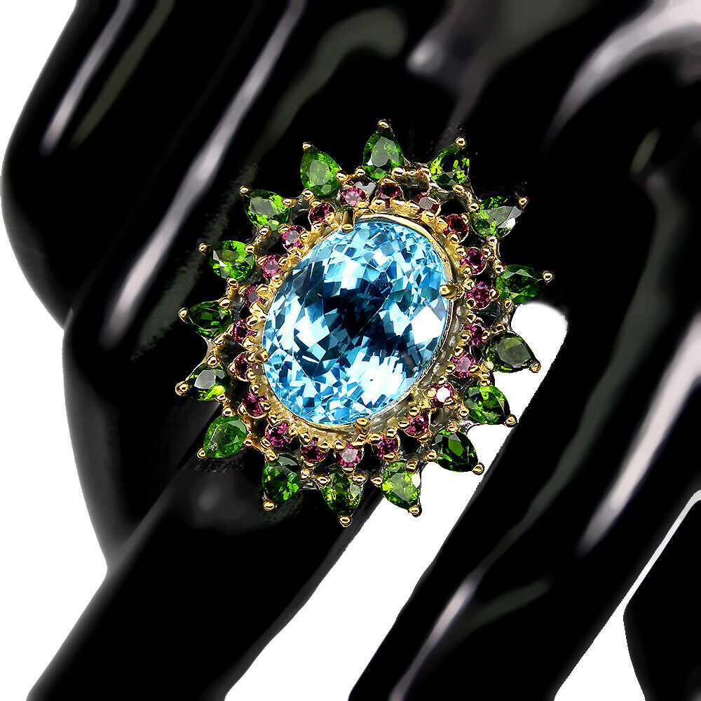 14K Gelb- und Weißgold plattierten Silber - 925 Ring mit natürlichem Granat (Rhodolith), Diopsid und 17kt himmelblauem Topas.