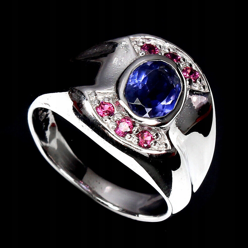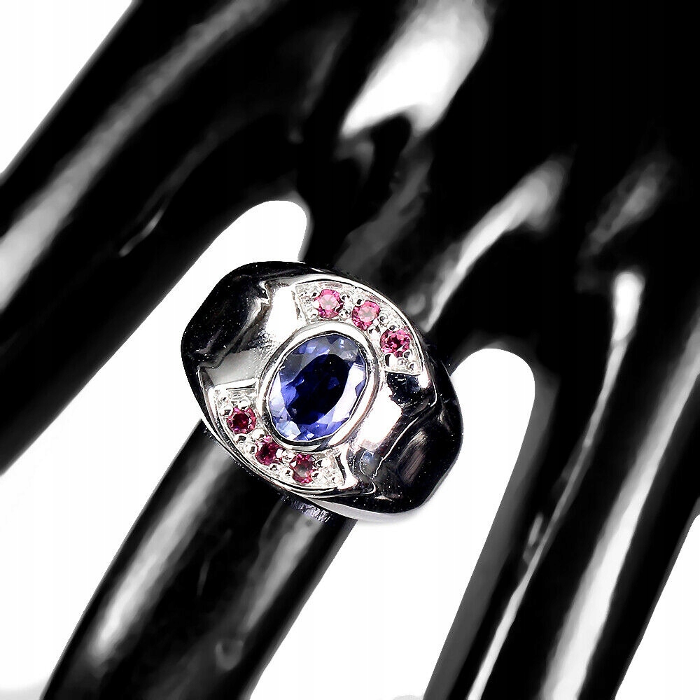 Silber - 925 - 14K Weißgold plattierten Ring mit natürlichem Iolith und Granat (Rhodolith) an.