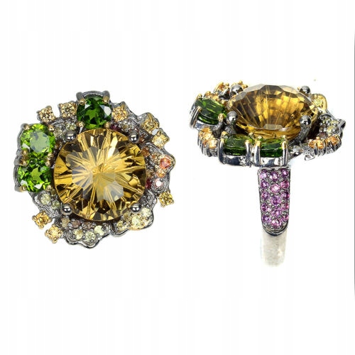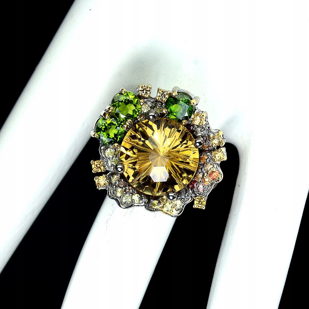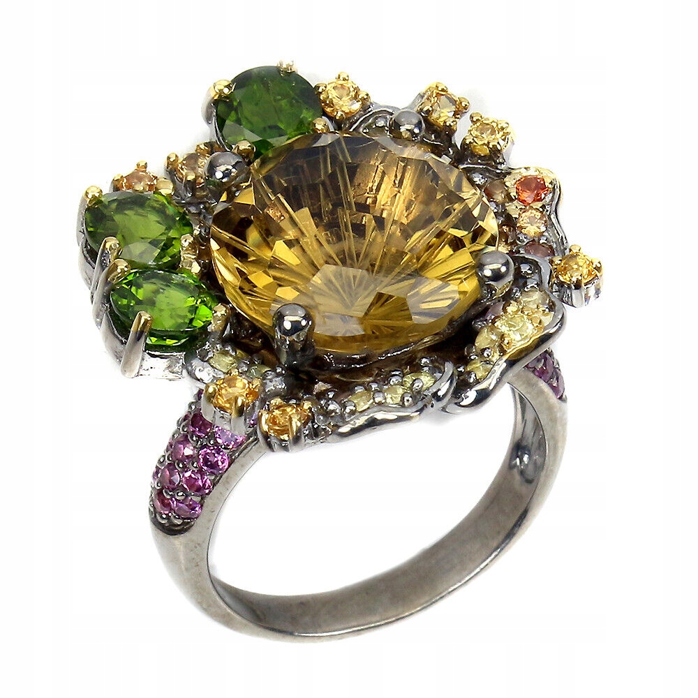 Wir bieten Ihnen einen neuen, 14K gelb vergoldeten und schwarz rhodinierten Ring aus 925er Silber mit natürlichen Granaten (Rhodolithen), Tsavoriten (eine seltene Art von Granat), Citrin und Songea-Saphiren.