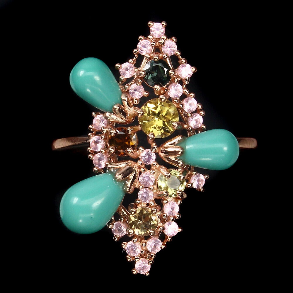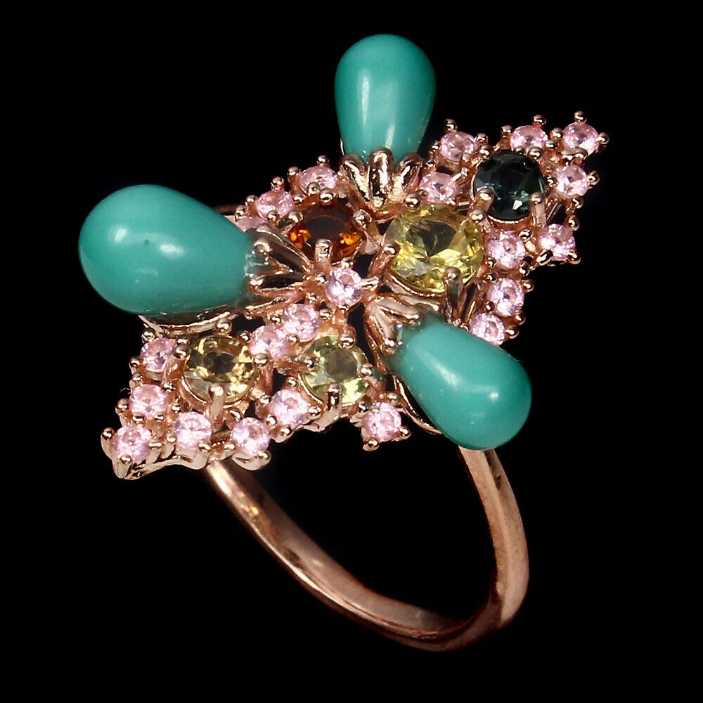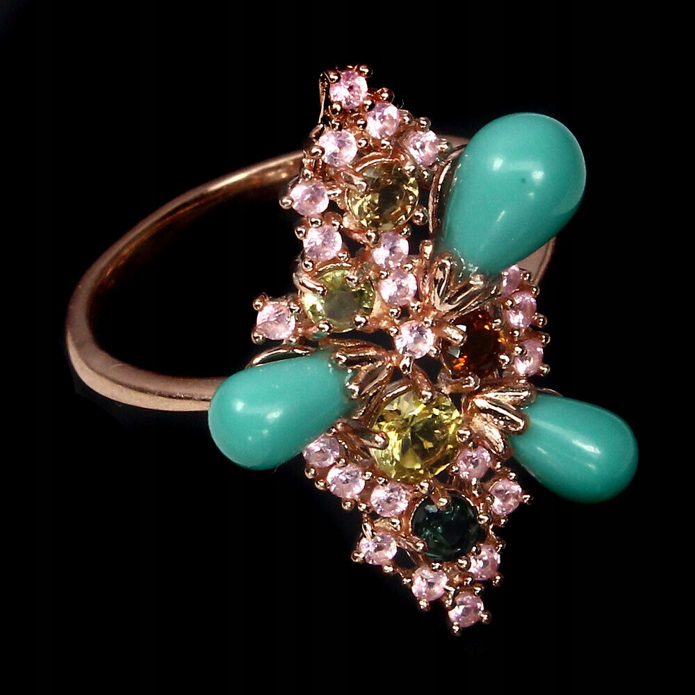 Ich verkaufe einen neuen (ohne Etikett), Silber - 925 - 14 Karat rosévergoldeter Ring mit natürlichen Turmalinen, Türkisen und künstlichen Nanosteinen.