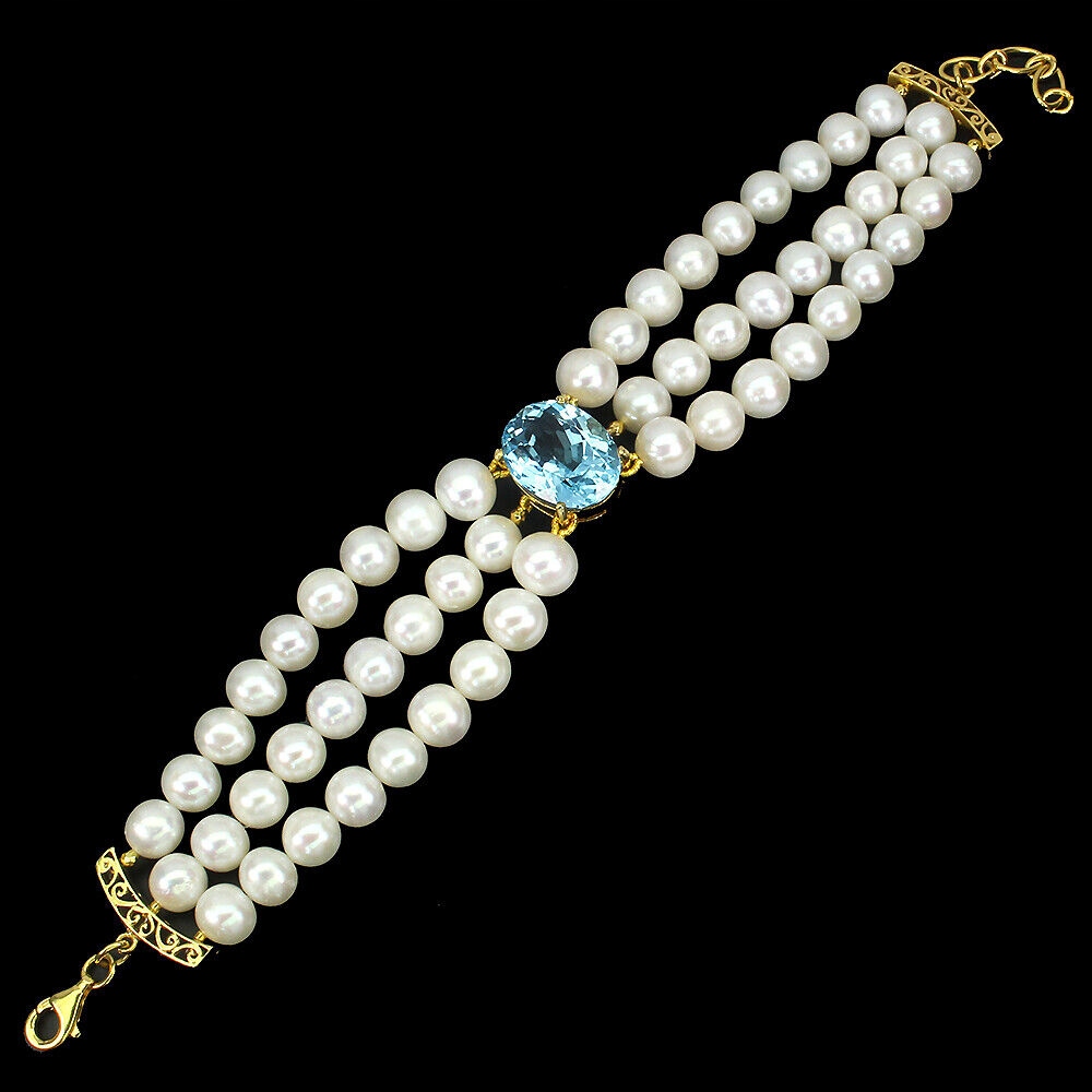 Wir bieten Ihnen ein neues Armband aus 14K Gelbgold, Silber - 925 mit Naturperlen und Sky Blue Topas.
