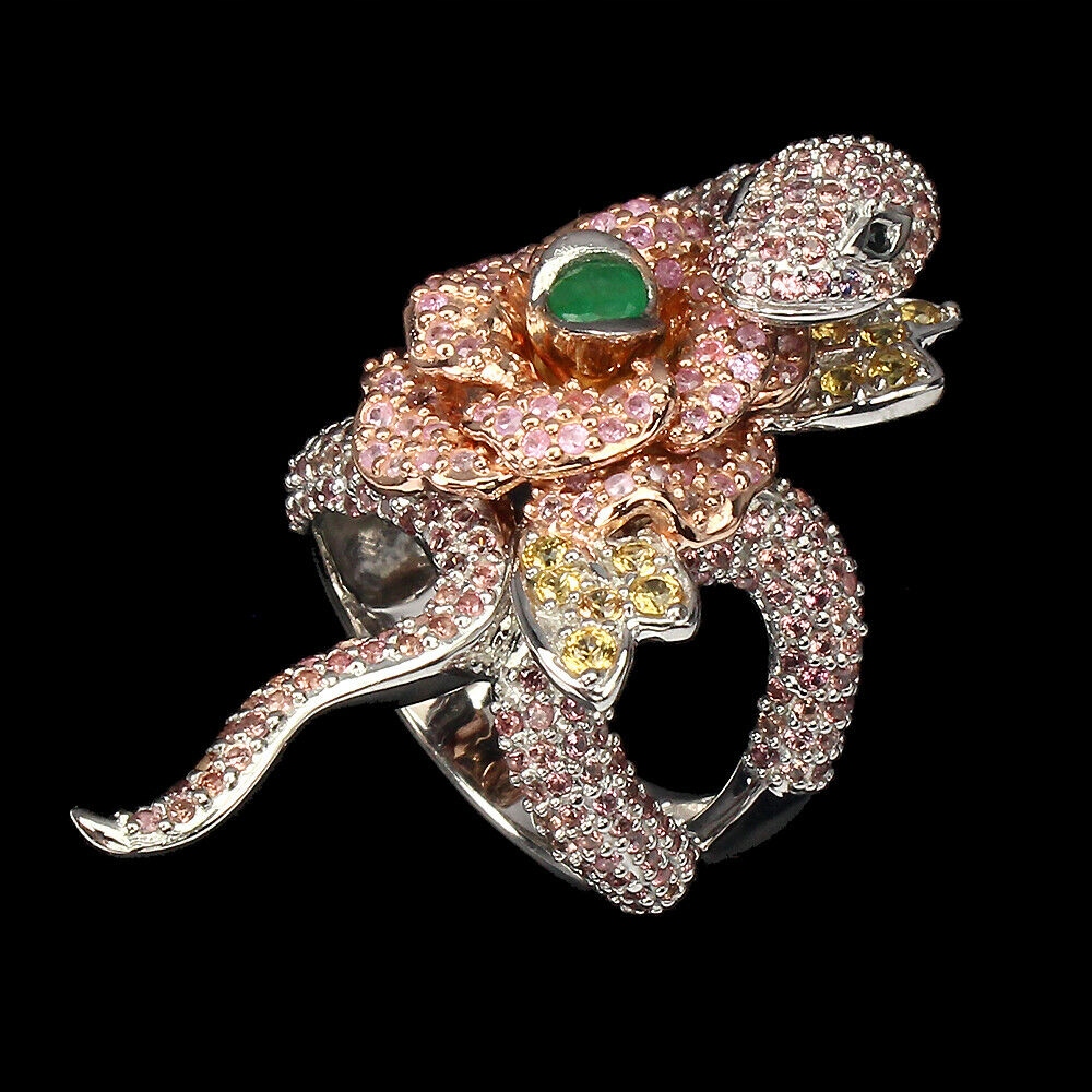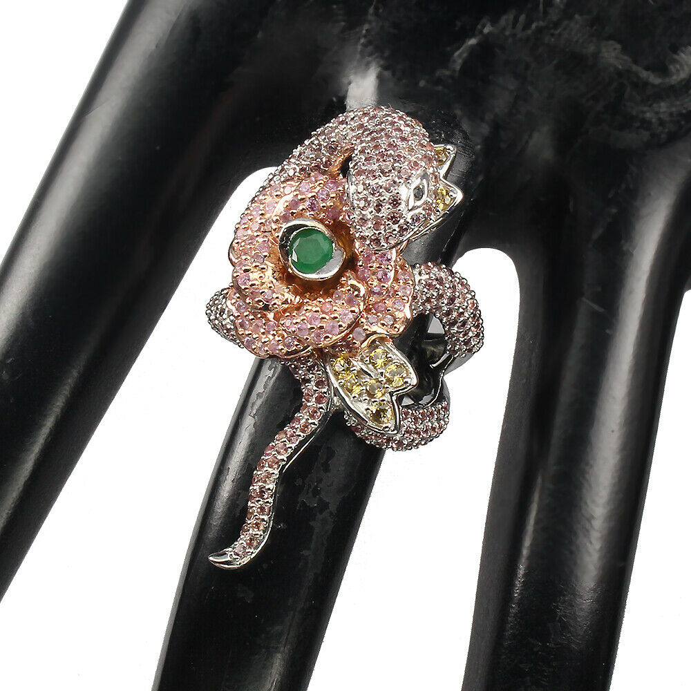 Ich verkaufe einen neuen, 14 Karat weiß- und rosévergoldeten Silber-925-Ring mit natürlichen Songea-Saphiren und Smaragden.