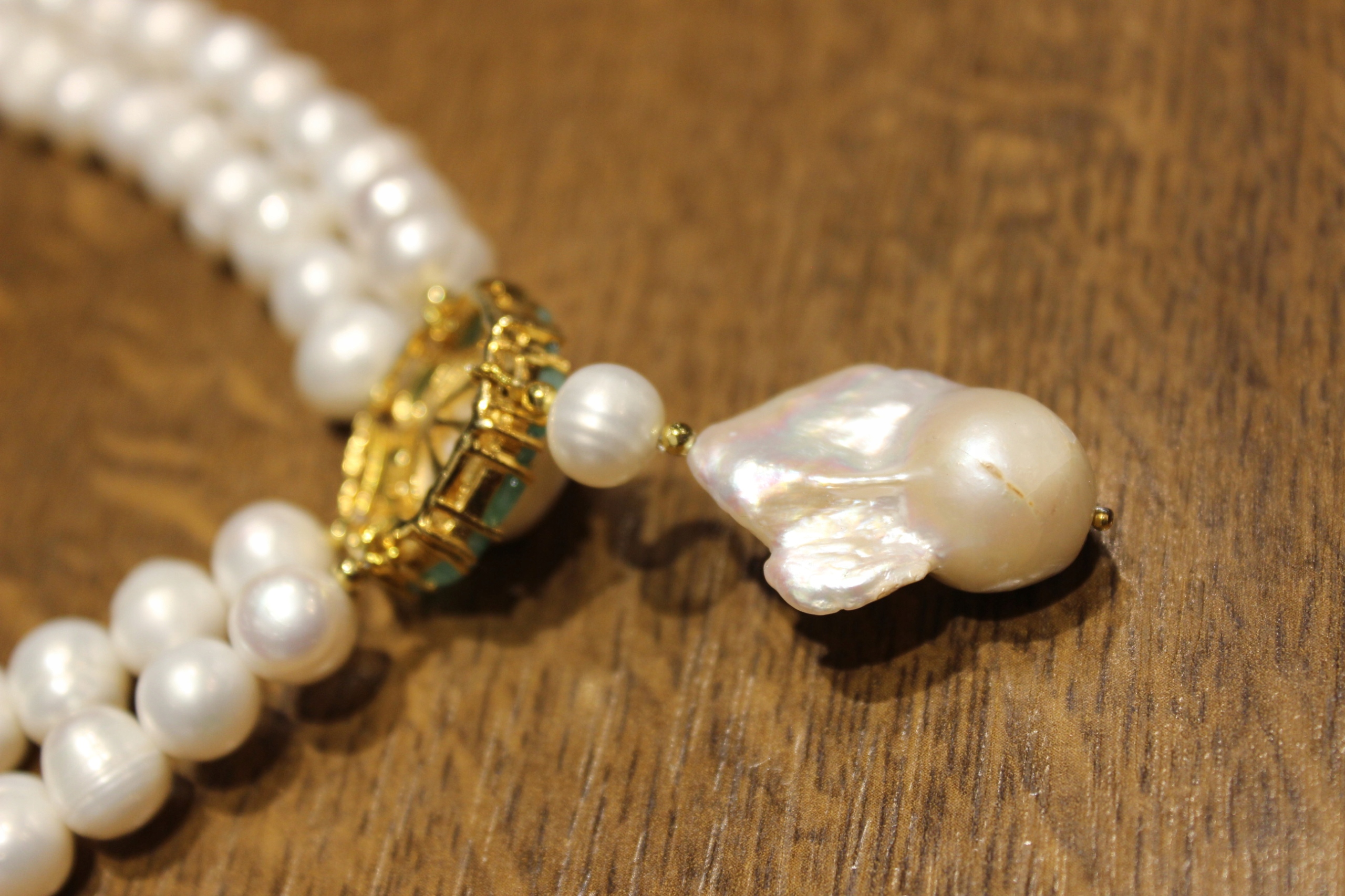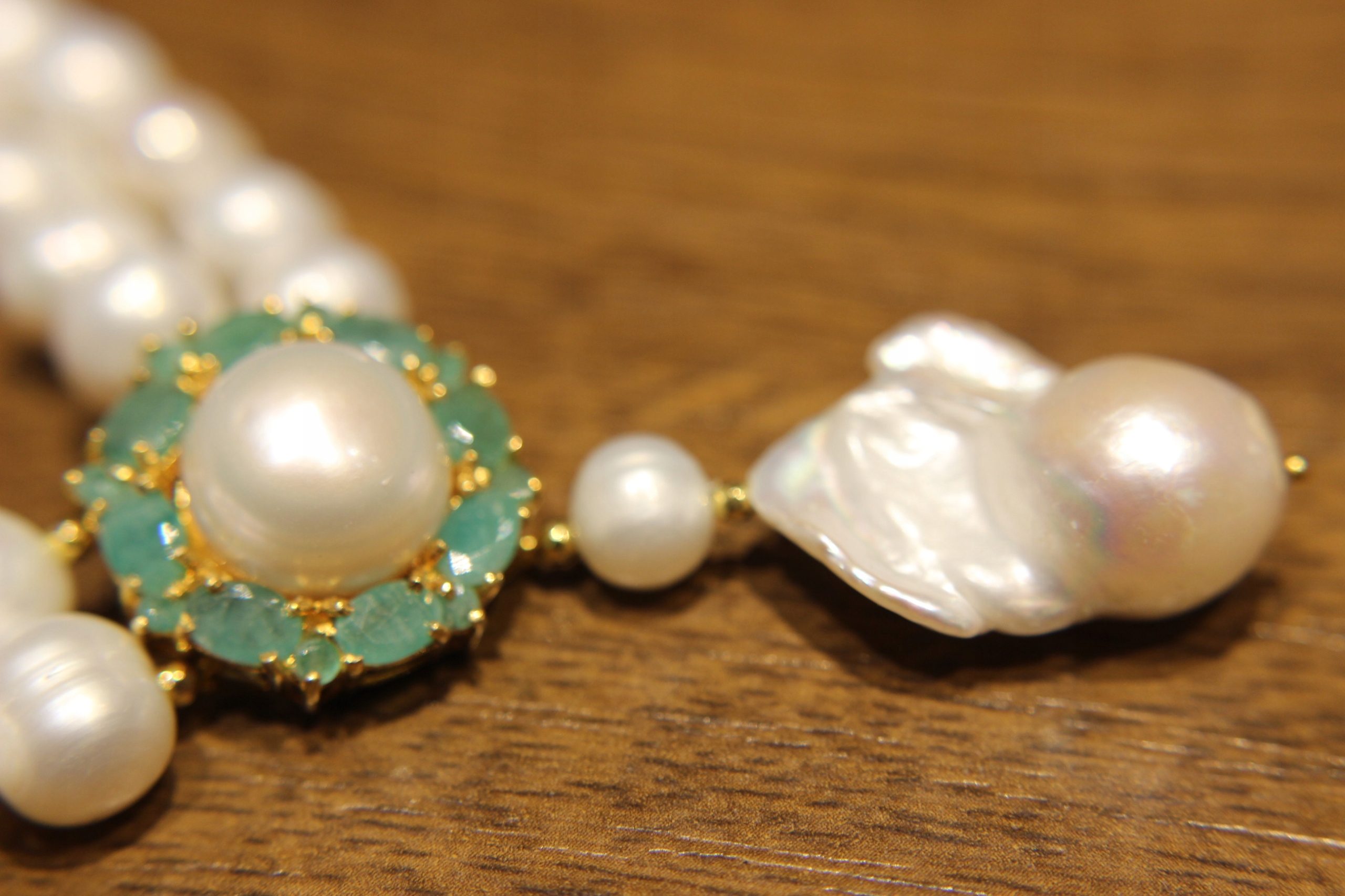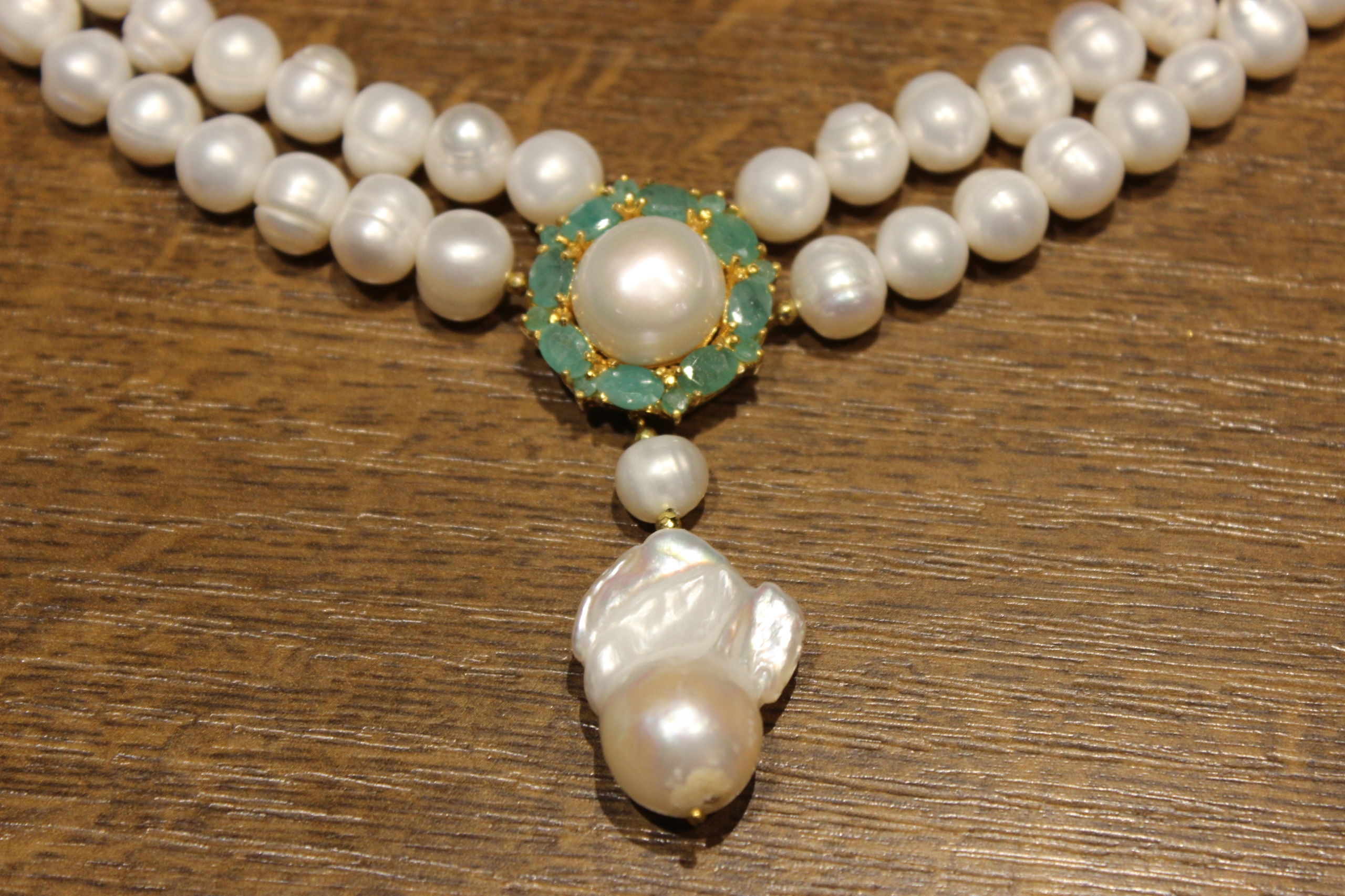 14 Karat gelbvergoldete Silber - 925er Silberkette mit Naturperlen und Smaragden an.