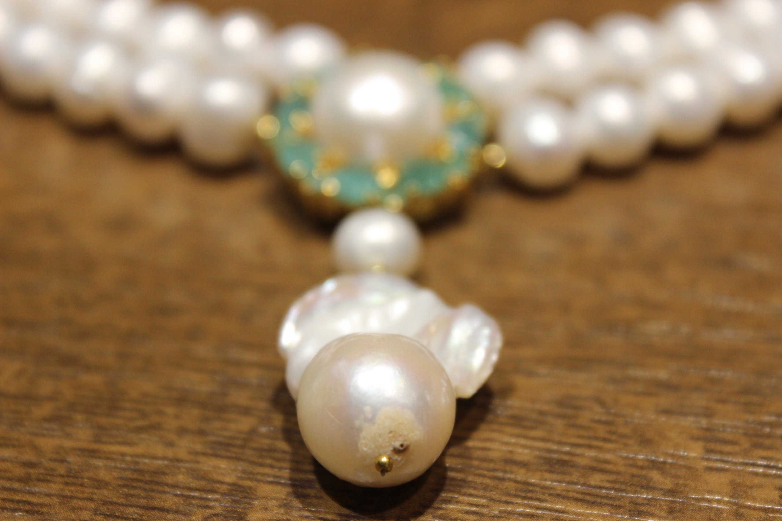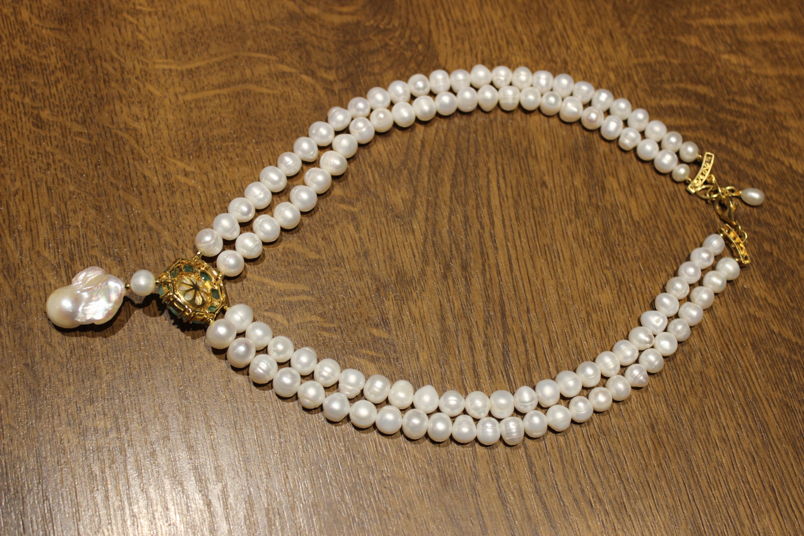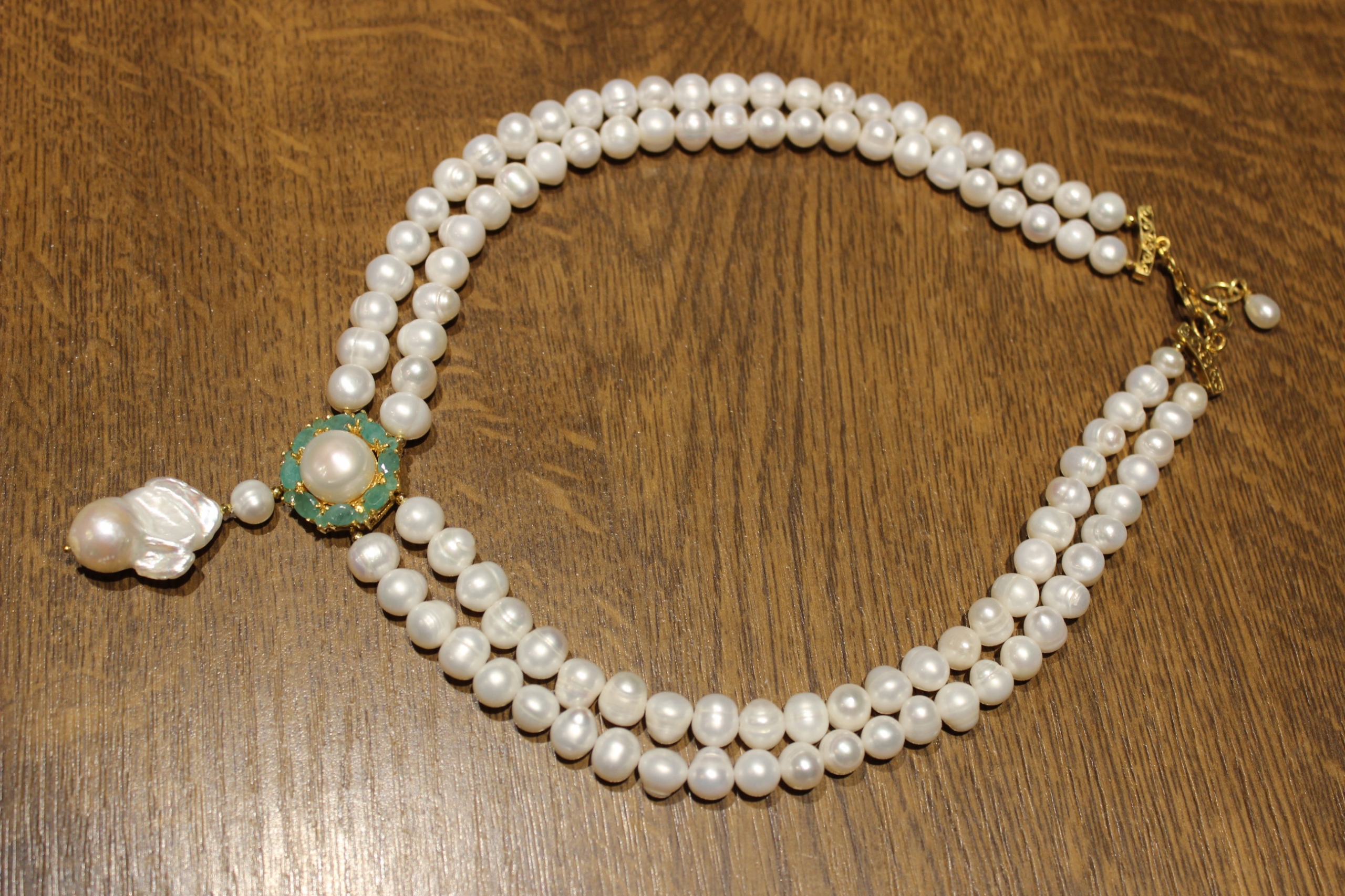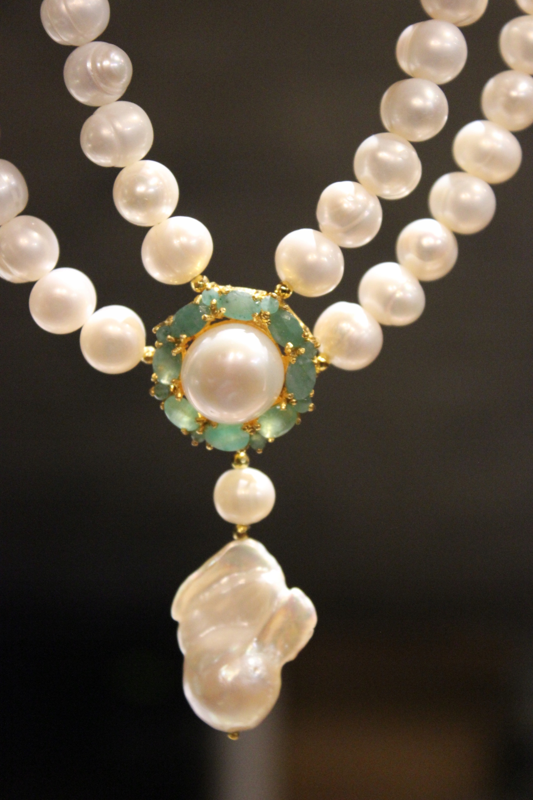 14 Karat gelbvergoldete Silber - 925er Silberkette mit Naturperlen und Smaragden an.
