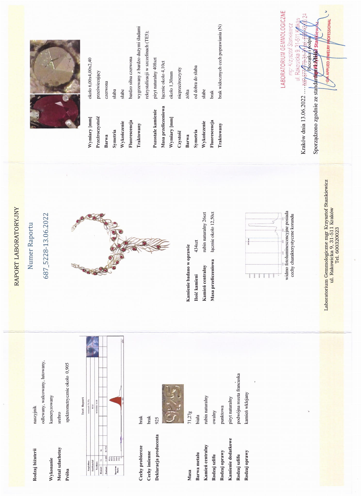 Anzahl Steine: 434 Stk. Zentralstein: Naturrubin: 26 Stk., ca. 12,50 ct, rote Farbe. Sonstige Steine: natürlicher Pyrit: 408 Stk., ca. 4,10 ct., Farbe: gelb. Eine detaillierte Beschreibung der Parameter der Steine finden Sie im Laborbericht - Zertifikat im Foto beigefügt.