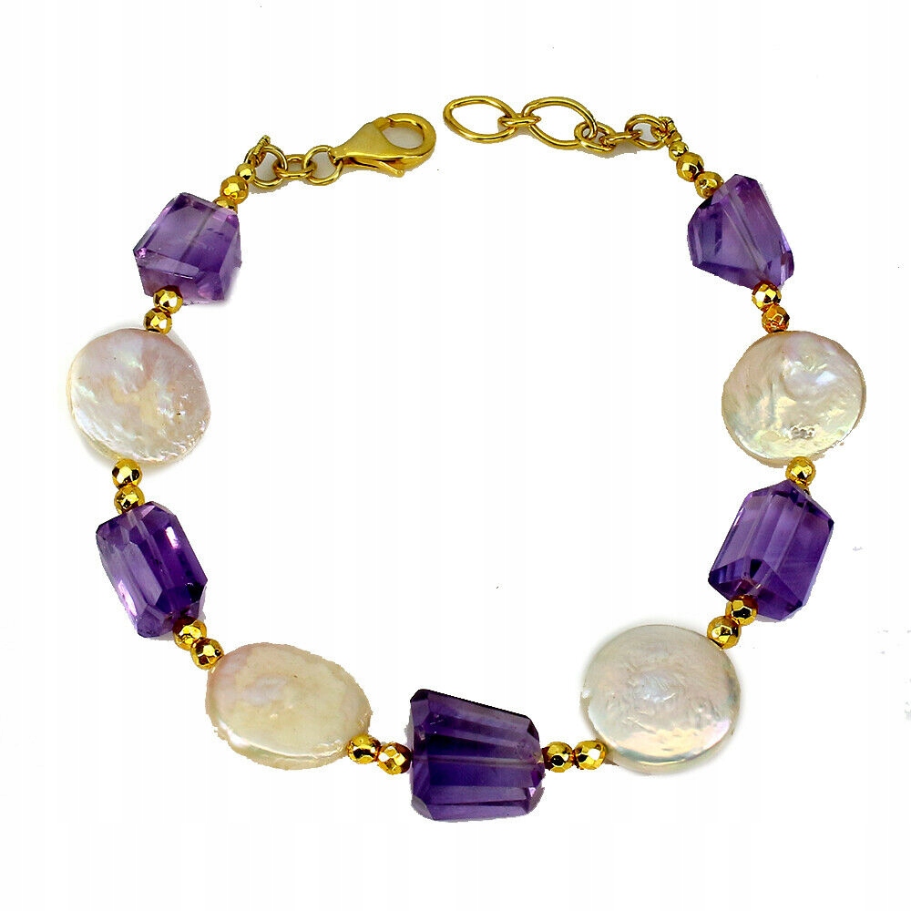 Mit Gelbgold 14K vergoldetes, Silber - 925 Armband mit natürlichen Amethysten und Perlen an.