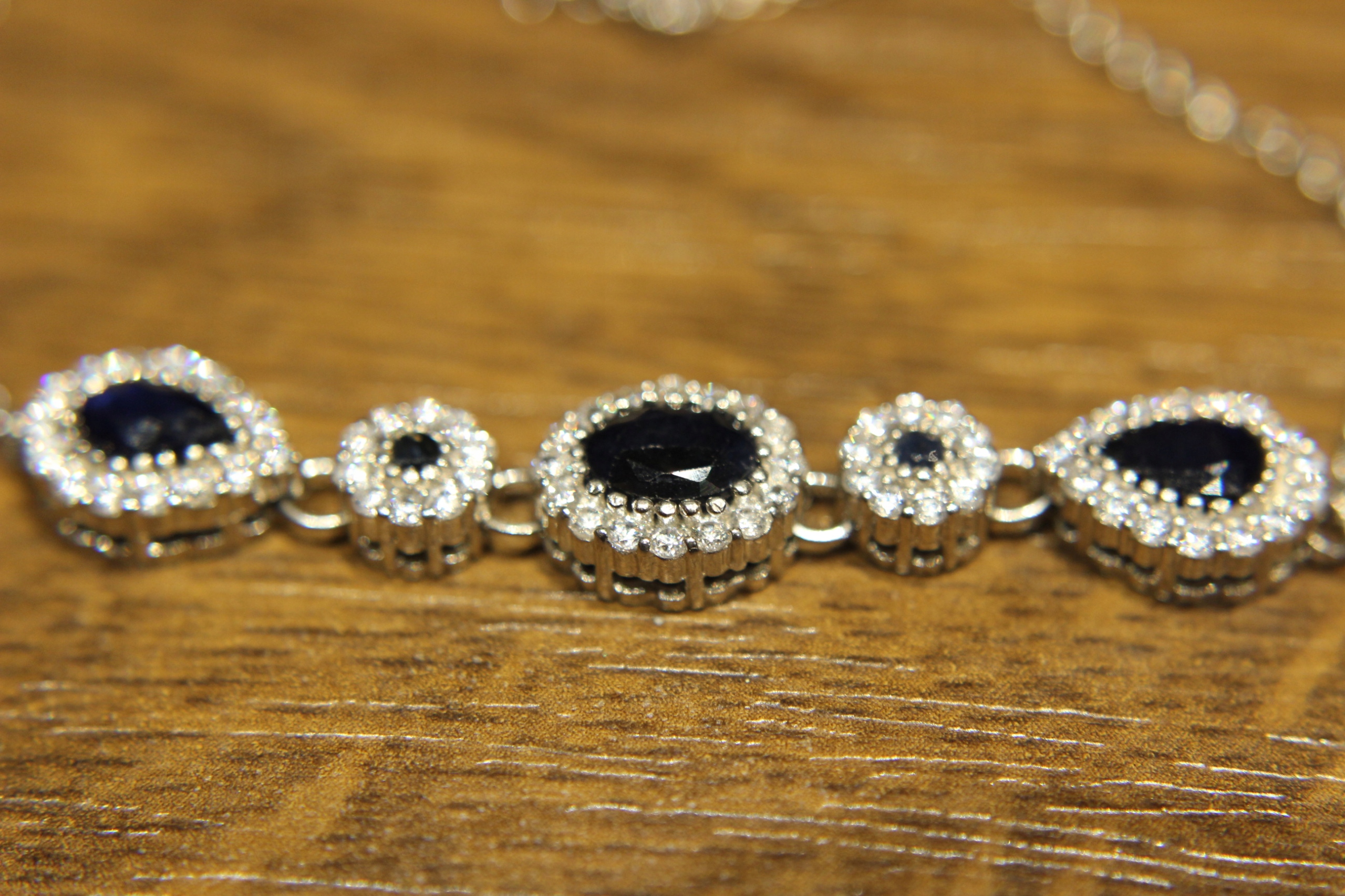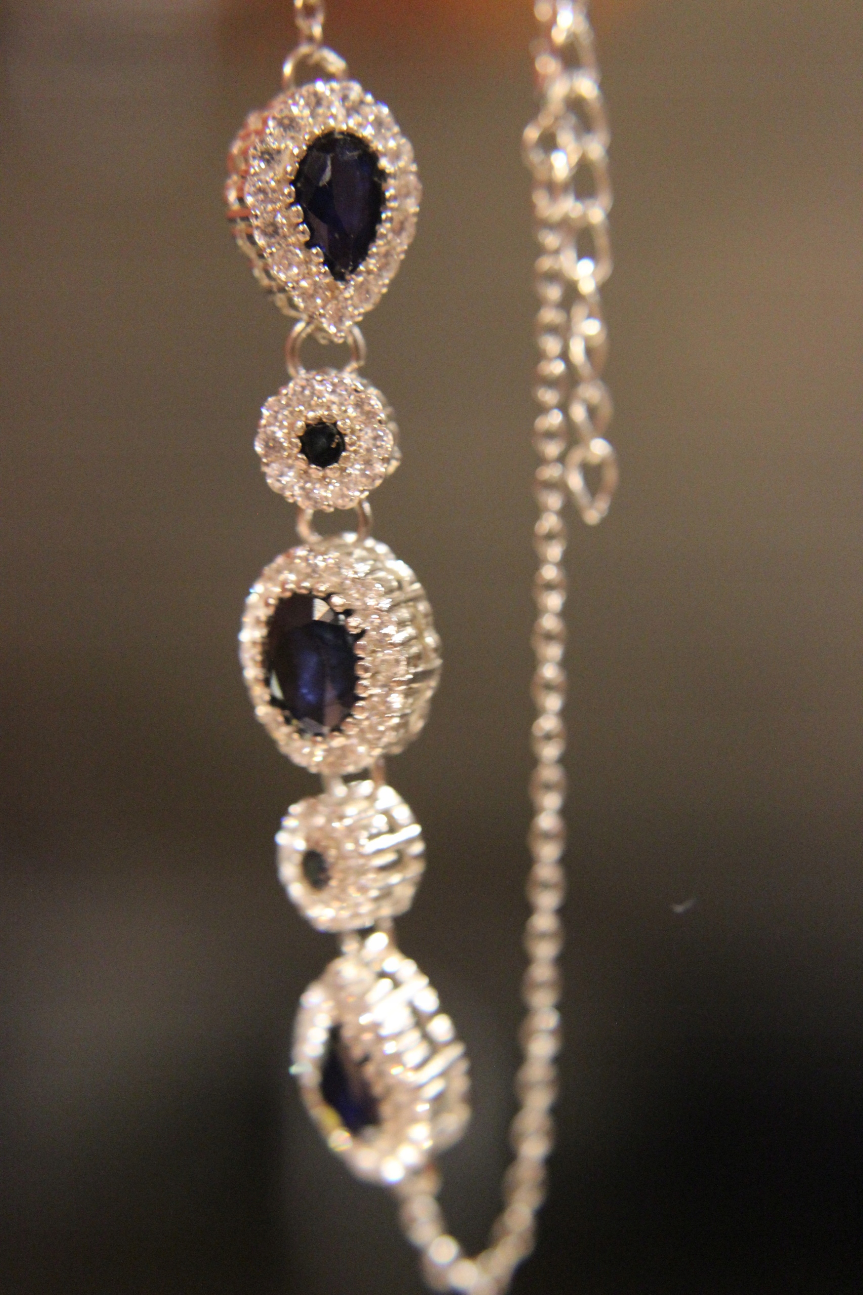 Wir bieten Ihnen ein neues, 14 Karat weiß vergoldetes, feines Armband aus Silber - 925 mit natürlichen Saphiren und Zirkonias an.