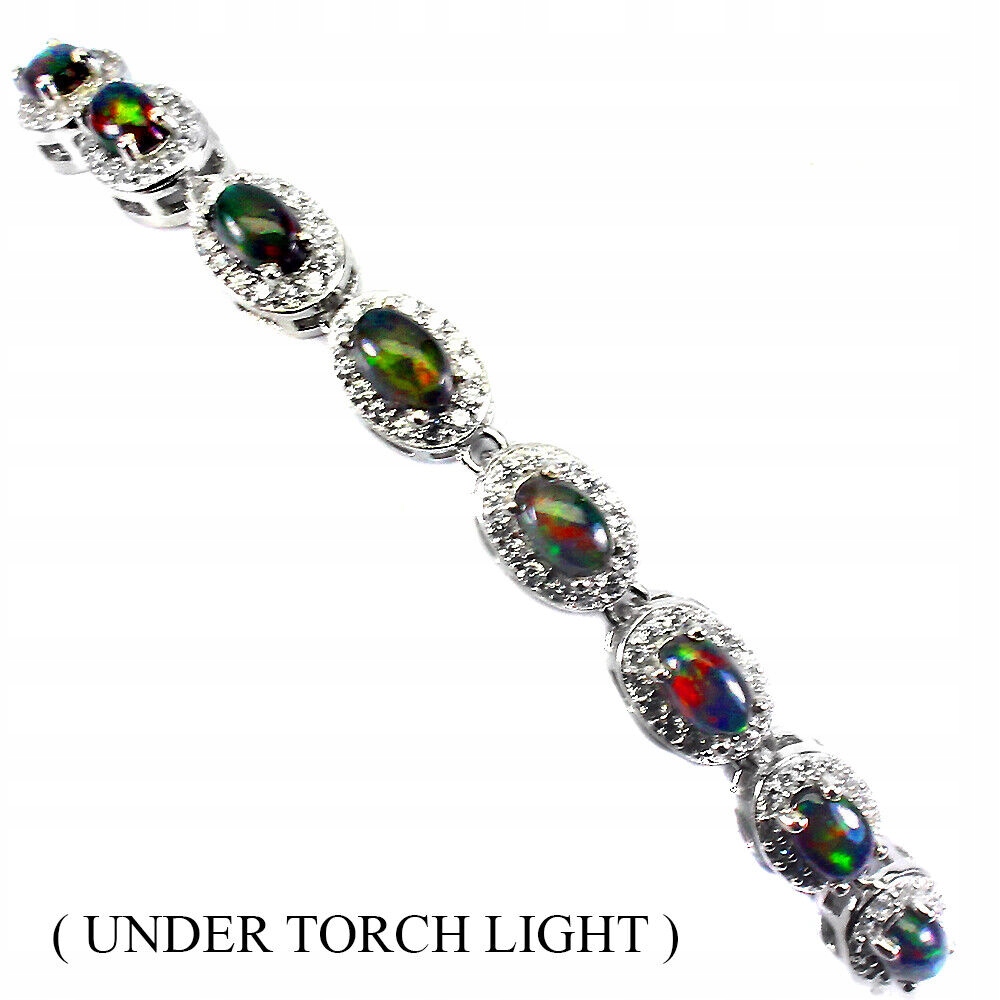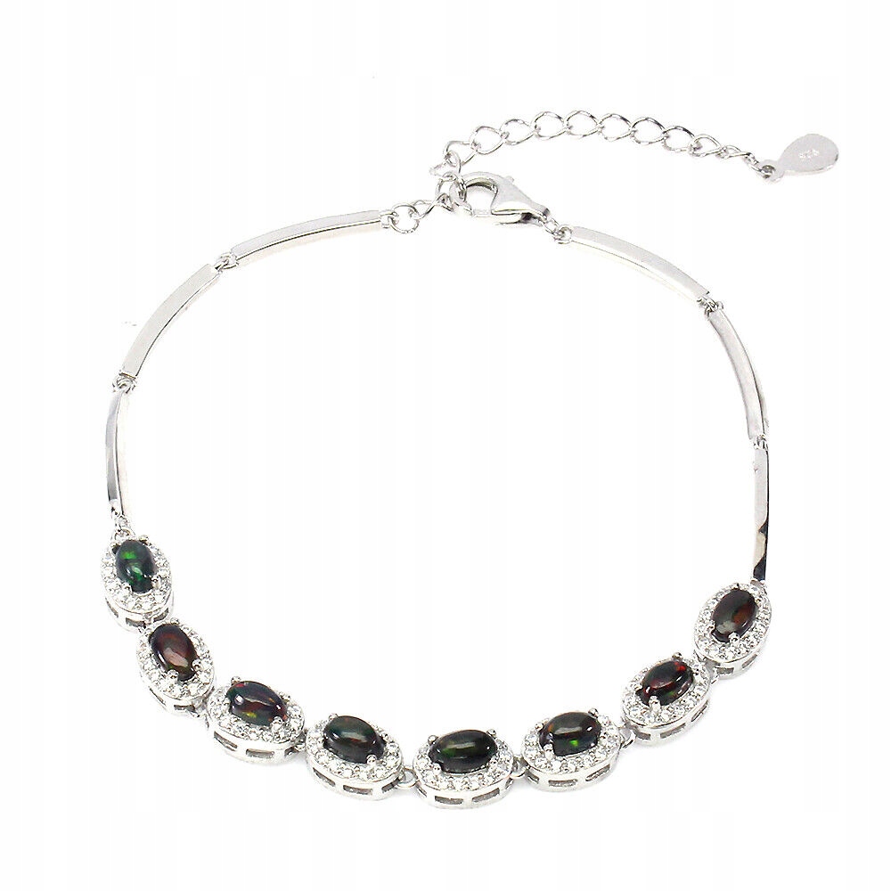 Wir bieten Ihnen ein neues, 14K weißvergoldetes Silber-925-Armband mit natürlichen schwarzen Opalen und Zirkonia an.