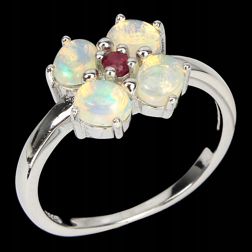 Wir bieten Ihnen einen neuen, 14 Karat weiß vergoldeten Silber-925-Ring mit natürlichen Feueropalen und Rubinen an.