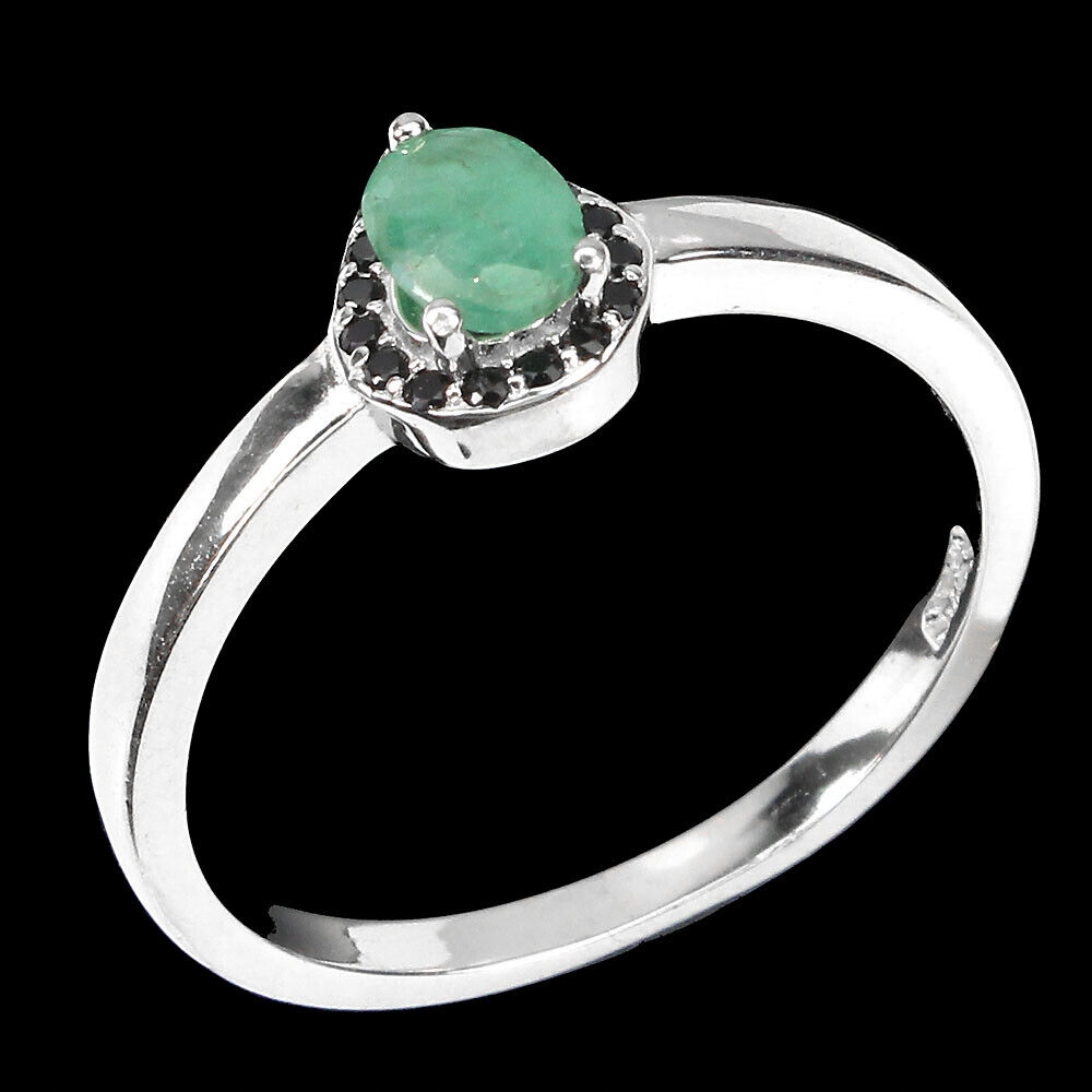 Wir bieten Ihnen einen neuen, 14K weißvergoldeten Silberring - 925 mit einem natürlichen Smaragd und schwarzen Spinellen.