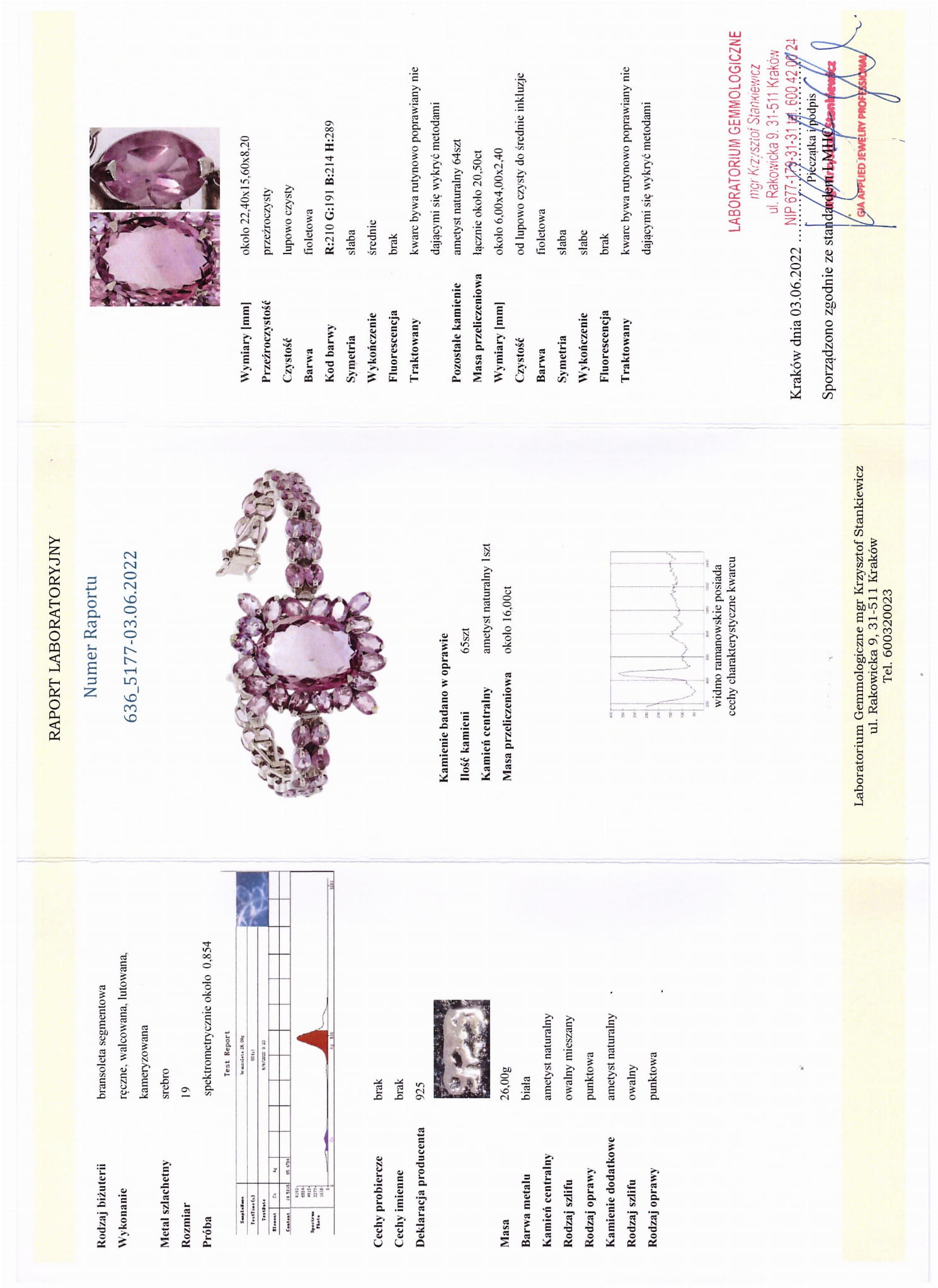 Anzahl Steine: 65 Stk. Mittelstein: natürlicher Amethyst 1 Stk., ca. 16ct. Andere Steine: natürlicher Amethyst: 64 Stück, ca. 20,50 ct. Eine detaillierte Beschreibung der Parameter der Steine finden Sie im Laborbericht - dem auf dem Foto sichtbaren Zertifikat.